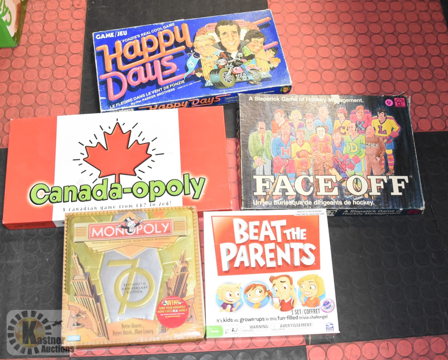 FACE OFF, CANADA-POLY, HAPPY DAYS, BEAT THE PARENTS, MONOPOLY (UNOPENED) 4 0F 5 GAMES SEEM TO HAVE ALL PIECES