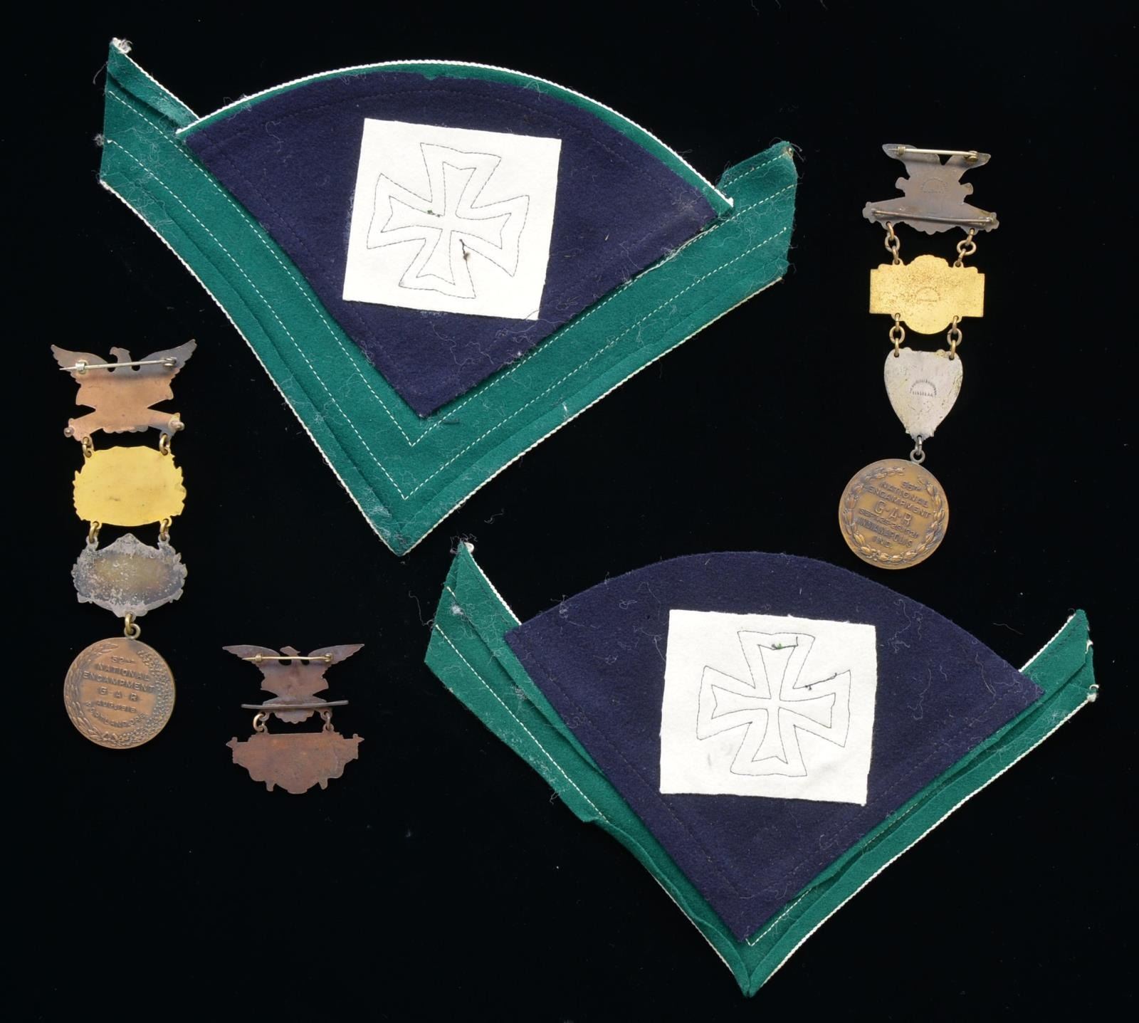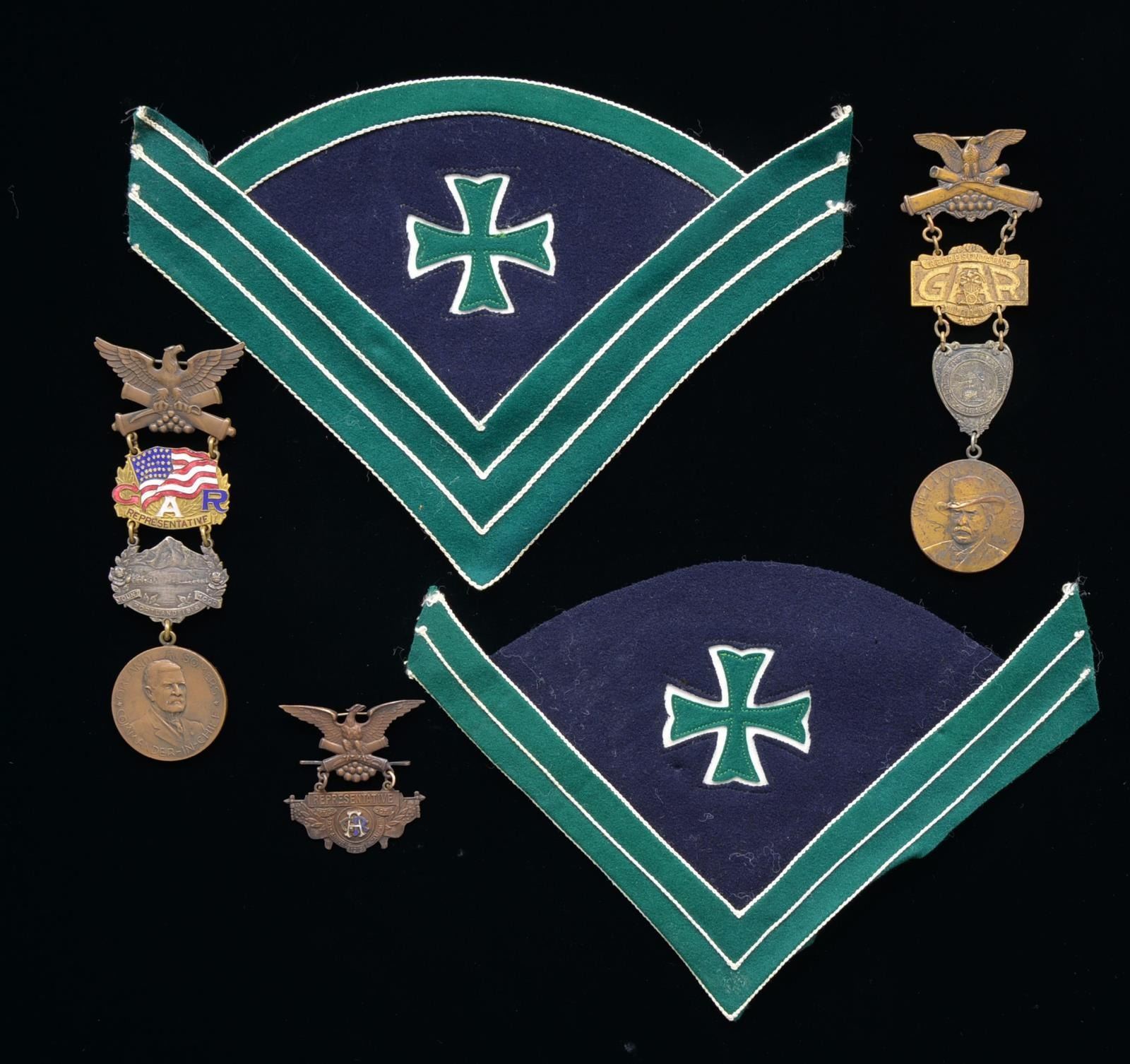 This group includes a GAR medal from the National Convention of 1921 in Indianapolis, IN. / GAR medal from the National Convention of 1918 in Portland, OR. / The top of a 1915 GAR National Convention badge. / Pair of Pattern 1888 Hospital Steward chevrons. CONDITION: badges are lacking ribbon. 1915 Badge is incomplete. Chevrons show light wear. (02-14052/BF). $150-300.