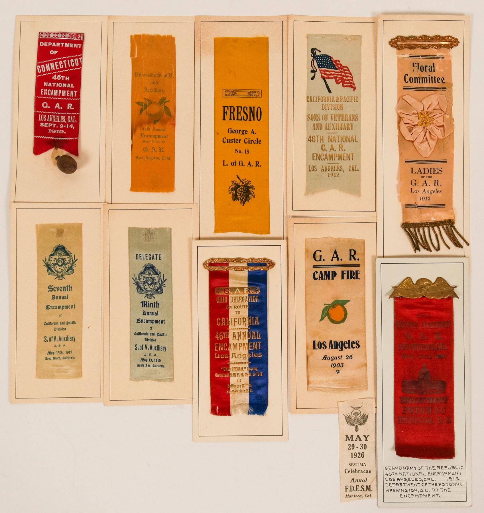 Eleven ribbon pin backs from various GAR events and gatherings from 1903 to 1926. All are in good condition and very colorful.