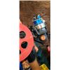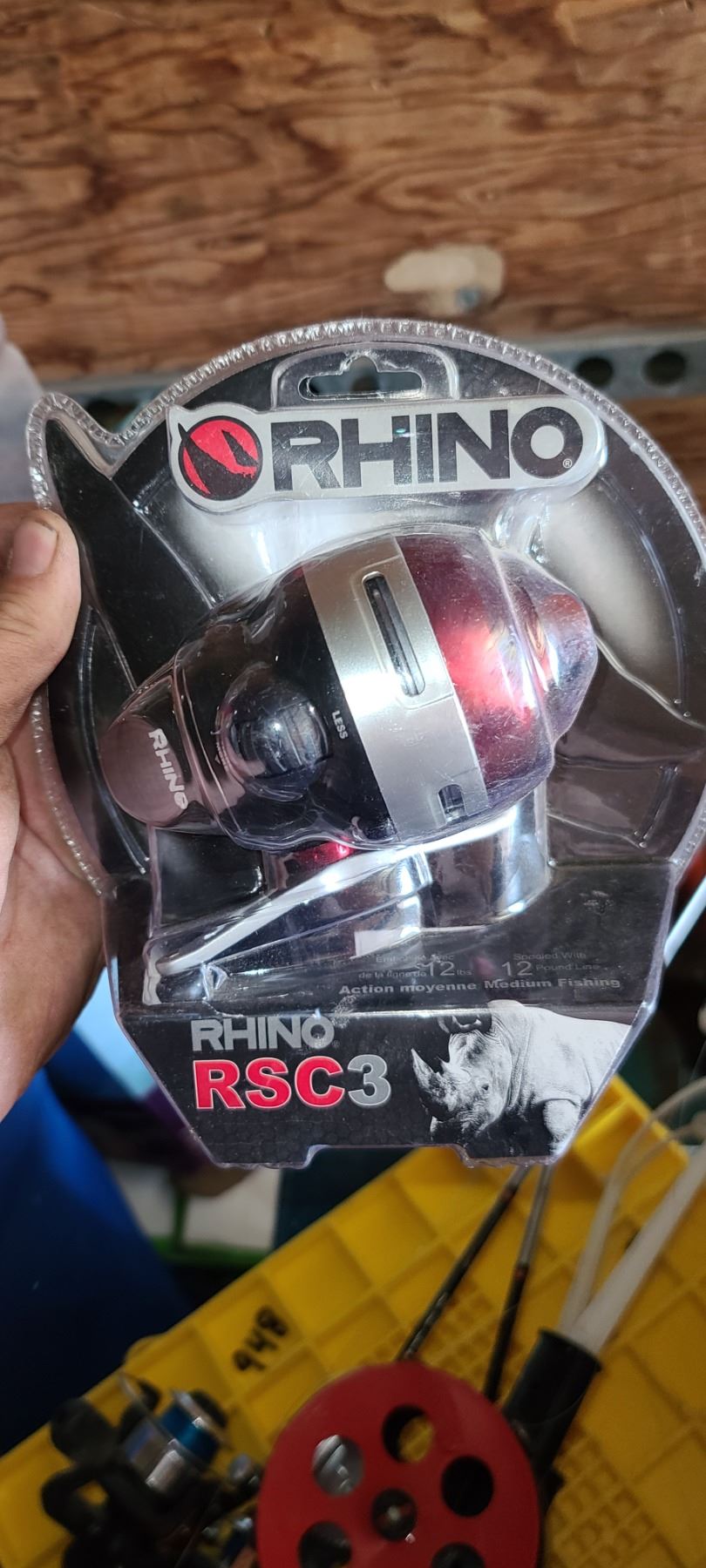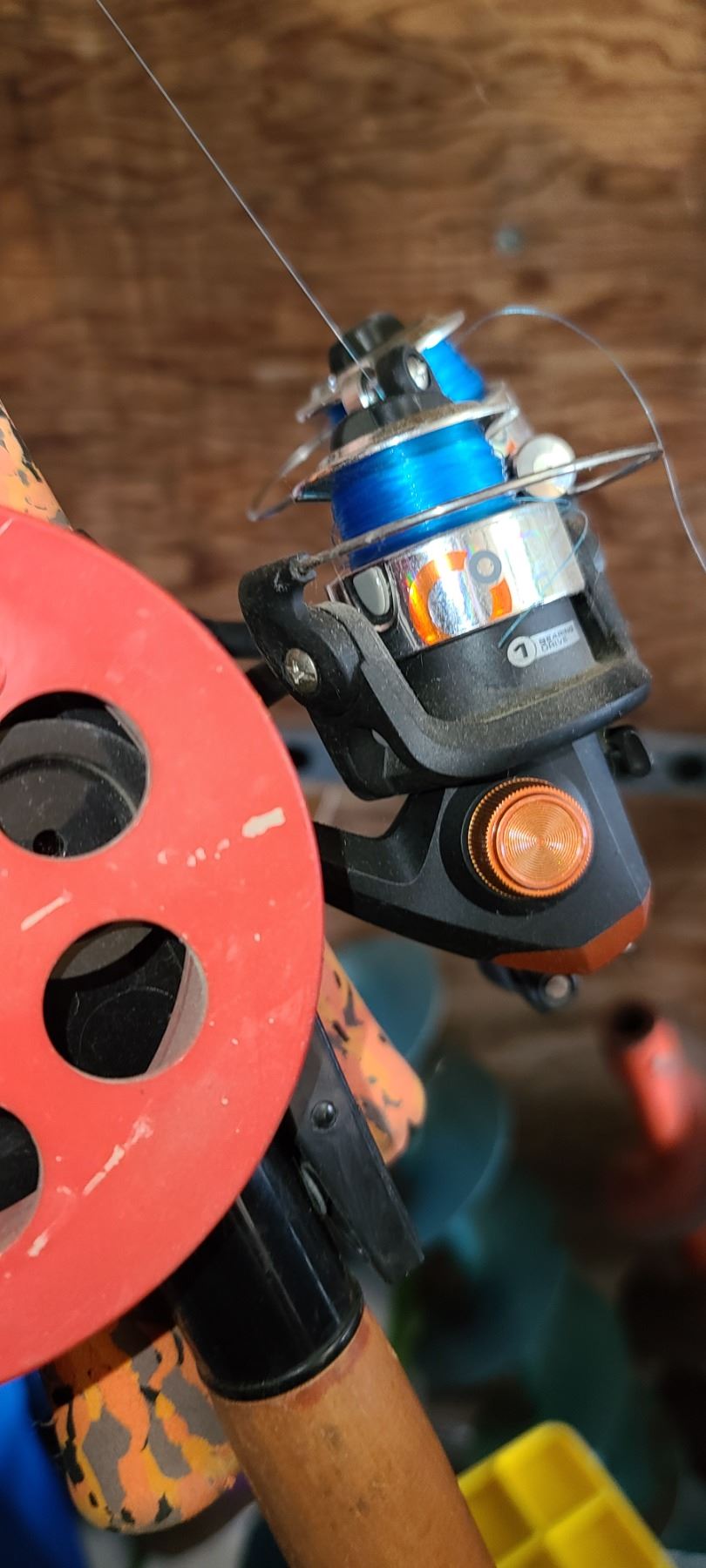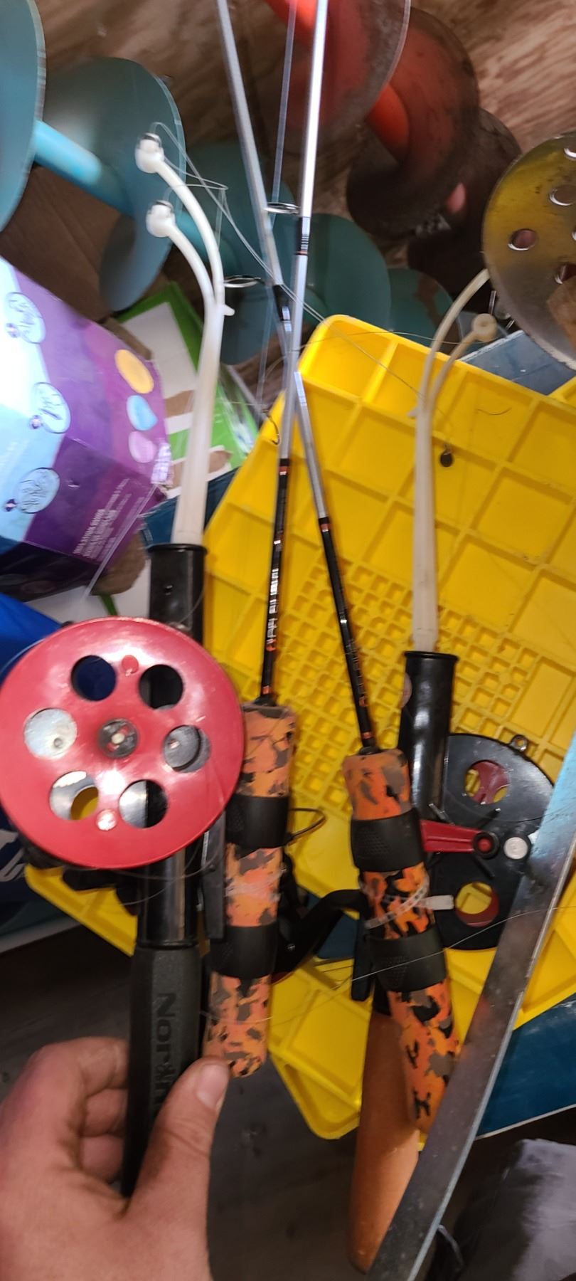 GARBAGE CANS (NEW) SS & PAIL OF ICE FISHING RODS & ACCESS.
