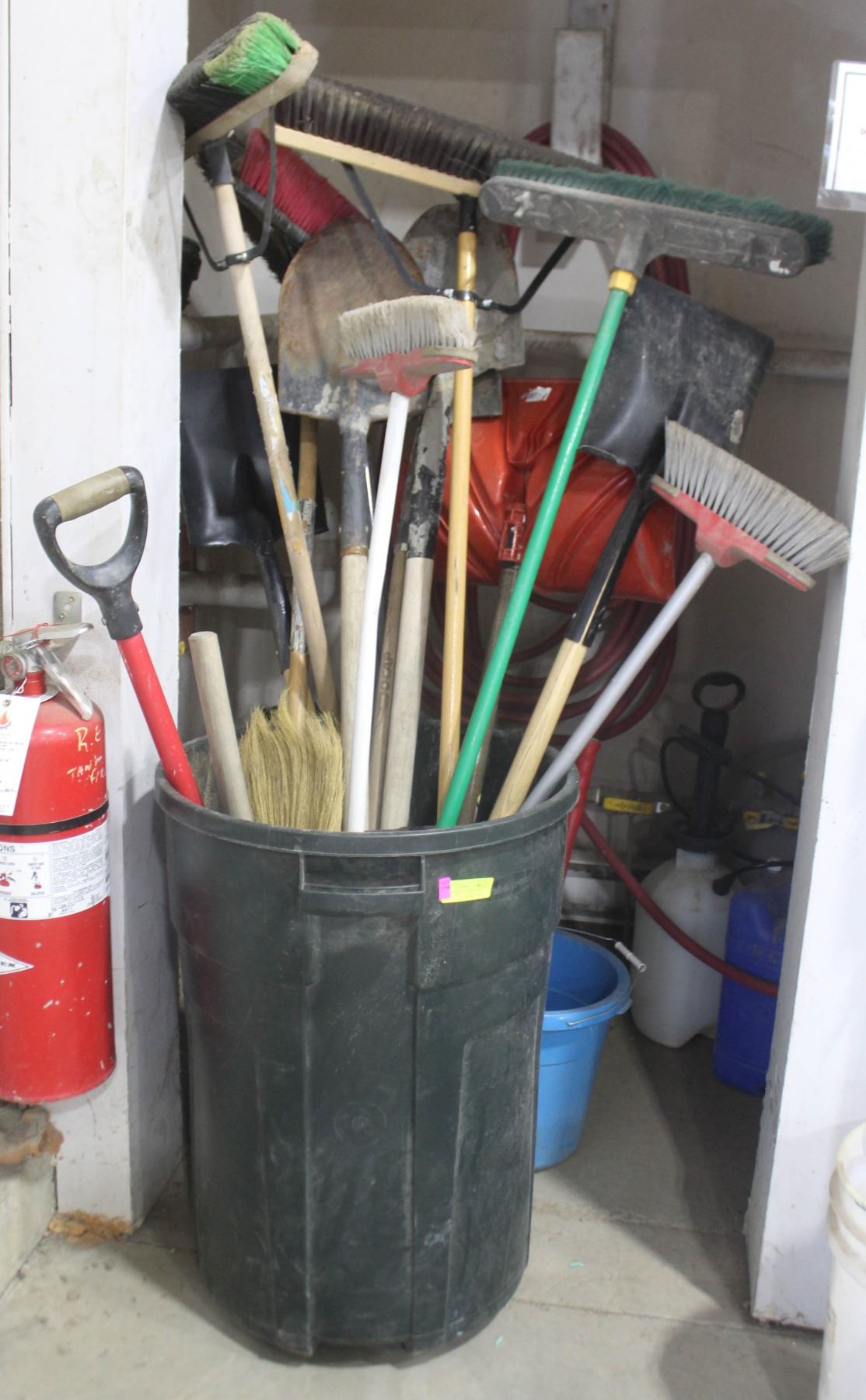 GARBAGE PAIL OF BROOMS AND SHOVELS