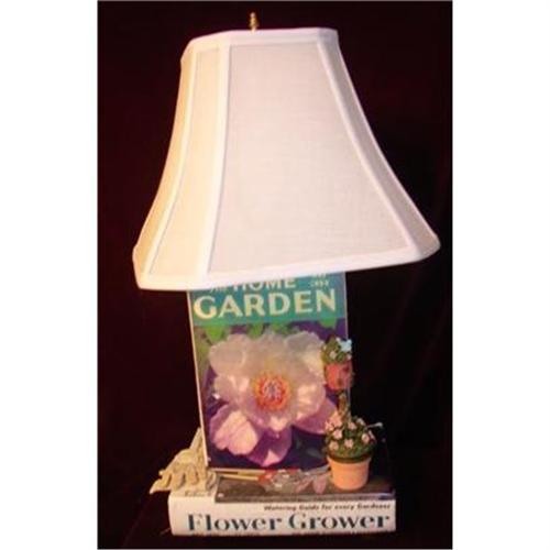 DESK LAMP made from REAL LAWBOOKS that we have decorated with a garden theme thusly you have a "GARDEN BOOK LAMP". We have decorated the old books with copies of old covers from Old Garden Books. We have also decorated the bottom book with a pair of garden gloves along with two reproduction minature shovels and a hoe. ALSO A POT WITH FLOWERS is attached to the bottom book.