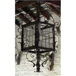 GARDEN ORNAMENTS - A large wrought iron electric lantern, square, with leaded glass panels, decoratively applied with leaves and scrollwork, 58in high, 25in wide, early 20th century (distressed) (see illustration)