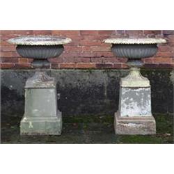GARDEN ORNAMENTS - A pair of Victorian cast iron garden vases, of compressed lobed form, with egg-and-dart rims, on knopped fluted pedestals and stepped tapering square plinths, 28in diam, 42in high