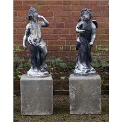 GARDEN ORNAMENTS - A good pair of lead figures of a young girl and Cupid, she lightly draped, her hair braided and adorned with flowers and leaves, he poised on one foot, each beside a disporting dolphin, on circular bases, 30in high, on chamfered square stone plinths, 46in overall, 18th century (losses) (see illustration)