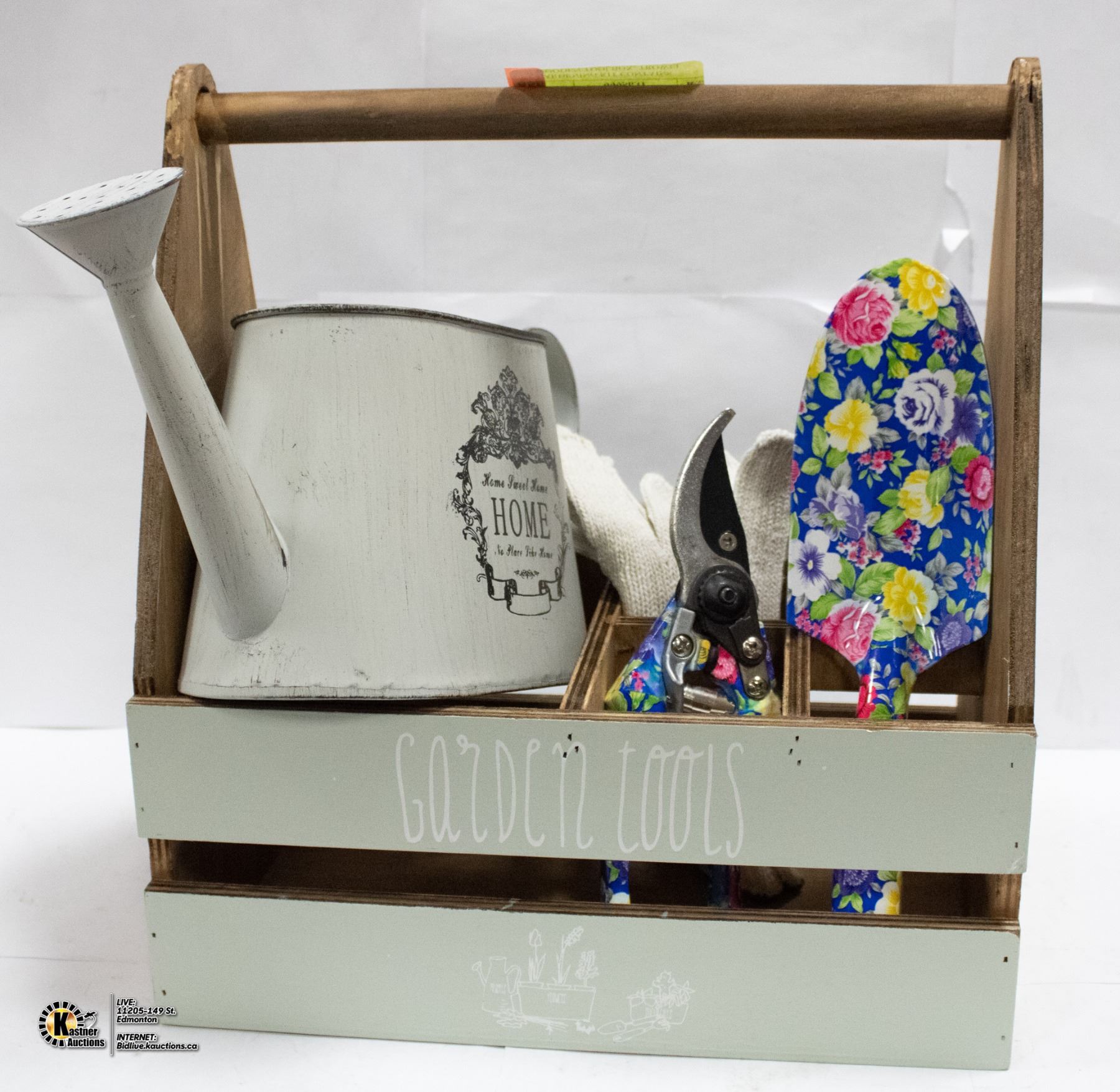 GARDENING KIT CONTAINS WOODEN TOOLBOX, TROWEL SHEARS AND GLOVES.