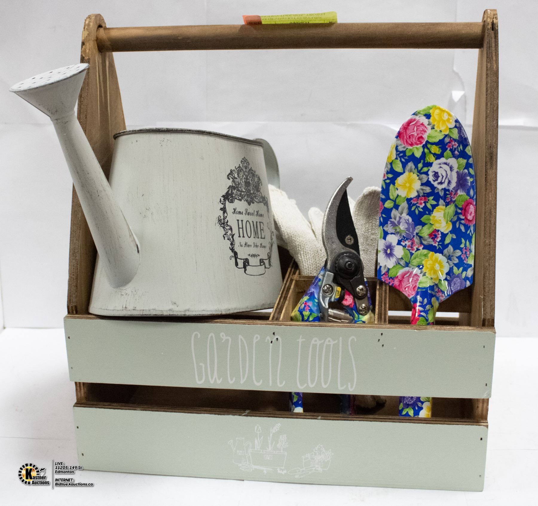 GARDENING KIT CONTAINS WOODEN TOOLBOX, TROWEL SHEARS AND GLOVES.