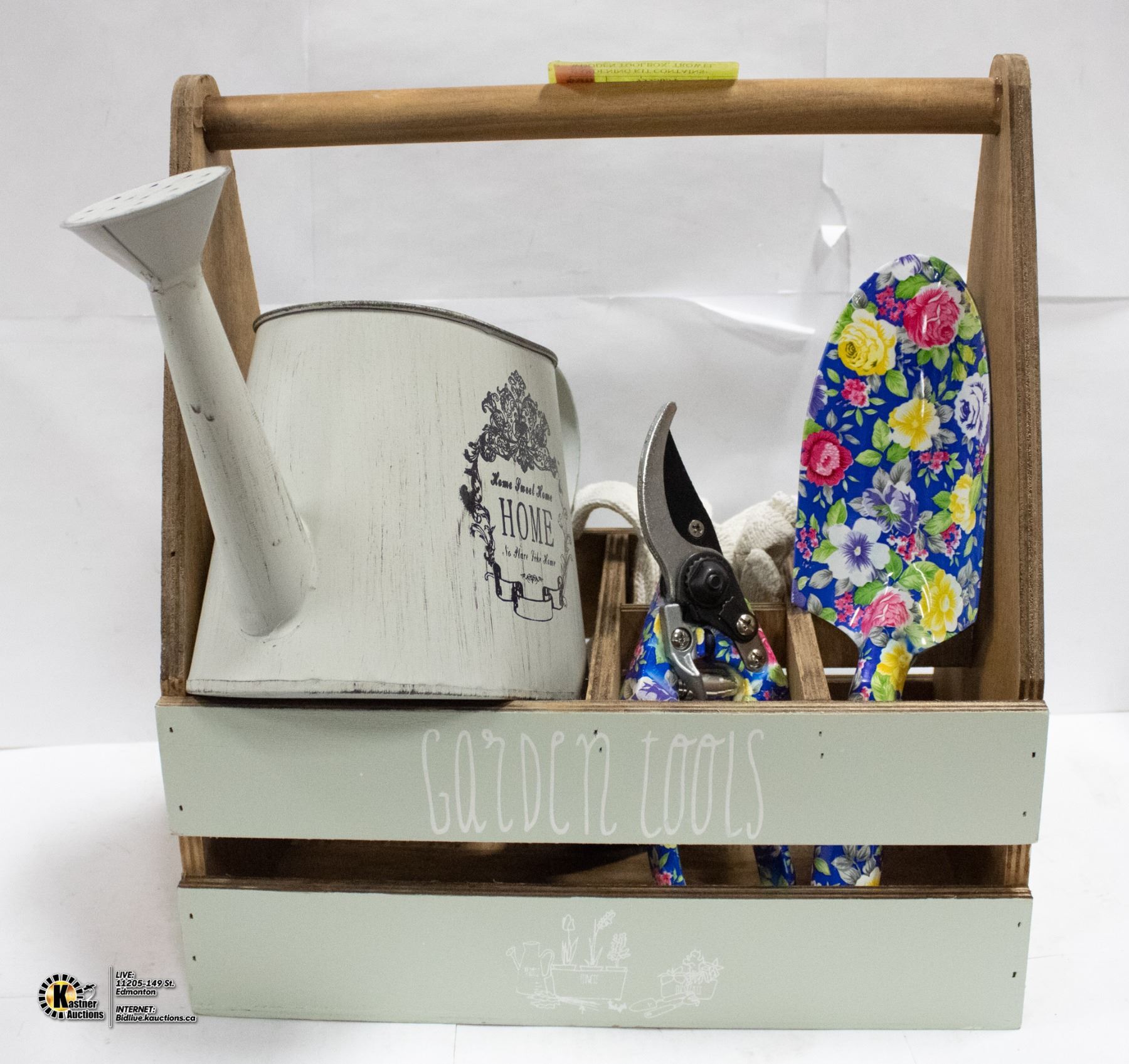 GARDENING KIT CONTAINS WOODEN TOOLBOX, TROWEL SHEARS AND GLOVES.