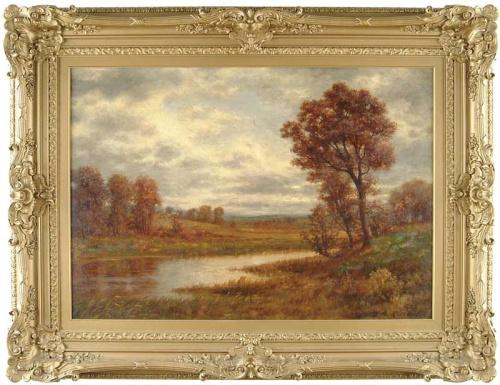 GARDNER ARNOLD RECKHARD (Reckard) (American, 1858-1908) EARLY FALL LANDSCAPE. Large oil on canvas scene shows small pond amongst tall trees with turning foliage. Sloping banks have colorful wildflowers and fields beyond. Gray and white clouds scattered amongst a blue sky. Signed lower right "G.A. Rickard". Housed in its magnificent wide and deep gesso decorated fancy frame. SIZE: 25-1/2" x 36-1/4". CONDITION: Relined, very good. Canvas appears to be mounted on hard board with canvas back. 9-25161