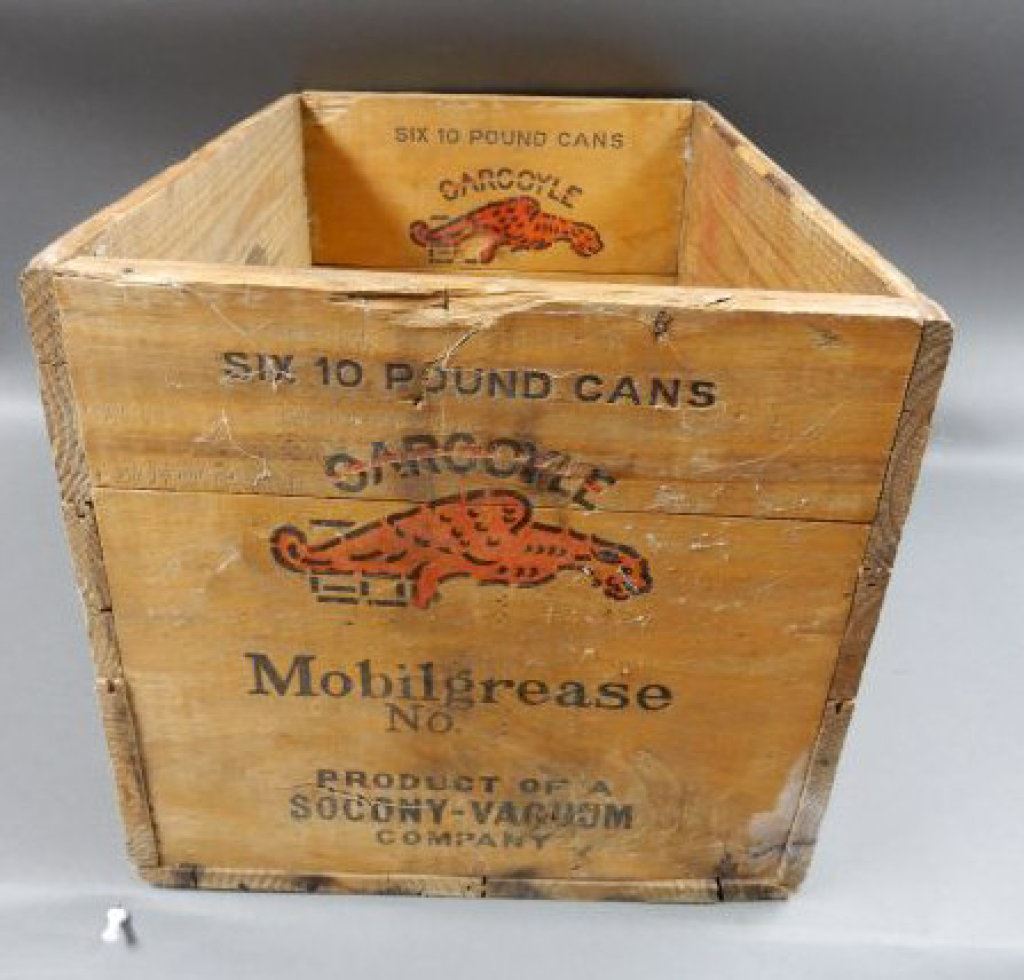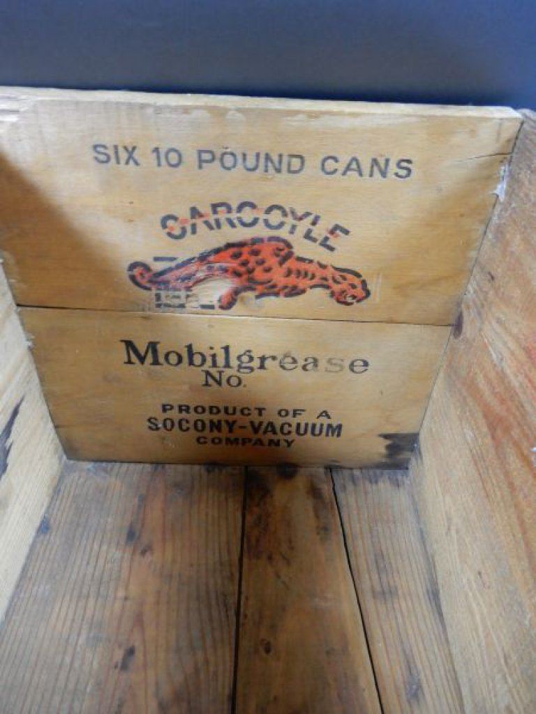 GARGOYLE MOBIL GREASE SIX 10 LB CAN WOODEN CRATE GOOD GRAPHICS LOCATION: LOWER LEFT