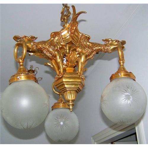 THIS WONDERFUL ANTIQUE CHANDELIER WITH MYTHOLOGICAL GARGOYLES FIGURES ARE WITH YOUR CONDITION, YOUR METAL IS SOLID BRONZE FOUNDRY OF THE ANTIQUE EPOCH , VERY HEAVY, REWIRED WORK PERFECTLY TO 3 STANDARDS BULBS. BEAUTIFUL HAND CARVED CRYSTAL GLOBES WITH VERY NICE STARTS, RARE PIECE TO FIND . , PROFESSIONAL PACKING, , THE COST U$S 200 IN USA , PAY THE BUYER. GOOD LUCK WITH THIS SPECIAL AND VALUABLE ANTIQUE PIECE.