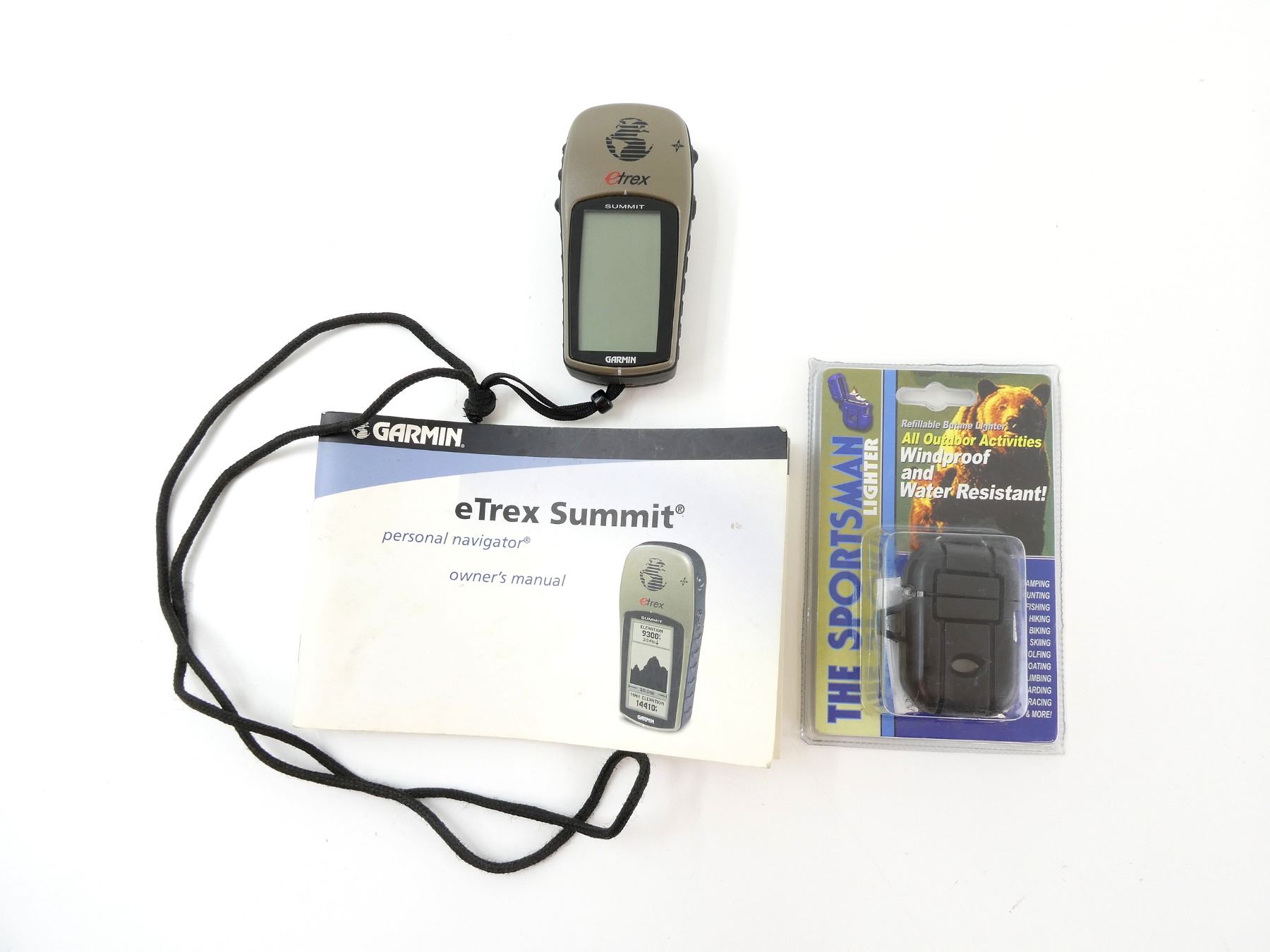 LOT INCLUDES; (1) GARMIN ETREX SUMMIT HANDHELD PERSONAL NAVIGATOR WITH INSTRUCTION MANUAL, ROPE LANYARD, BATTERY POWERED, TURNS ON, NOT FULLY TESTED & (1) THE SPORTSMAN LIGHTER, WINDPROOF & WATER RESISTANT, REFILLABLE, NOS, UN-OPENED PACKAGING. SEE PHOTOS.