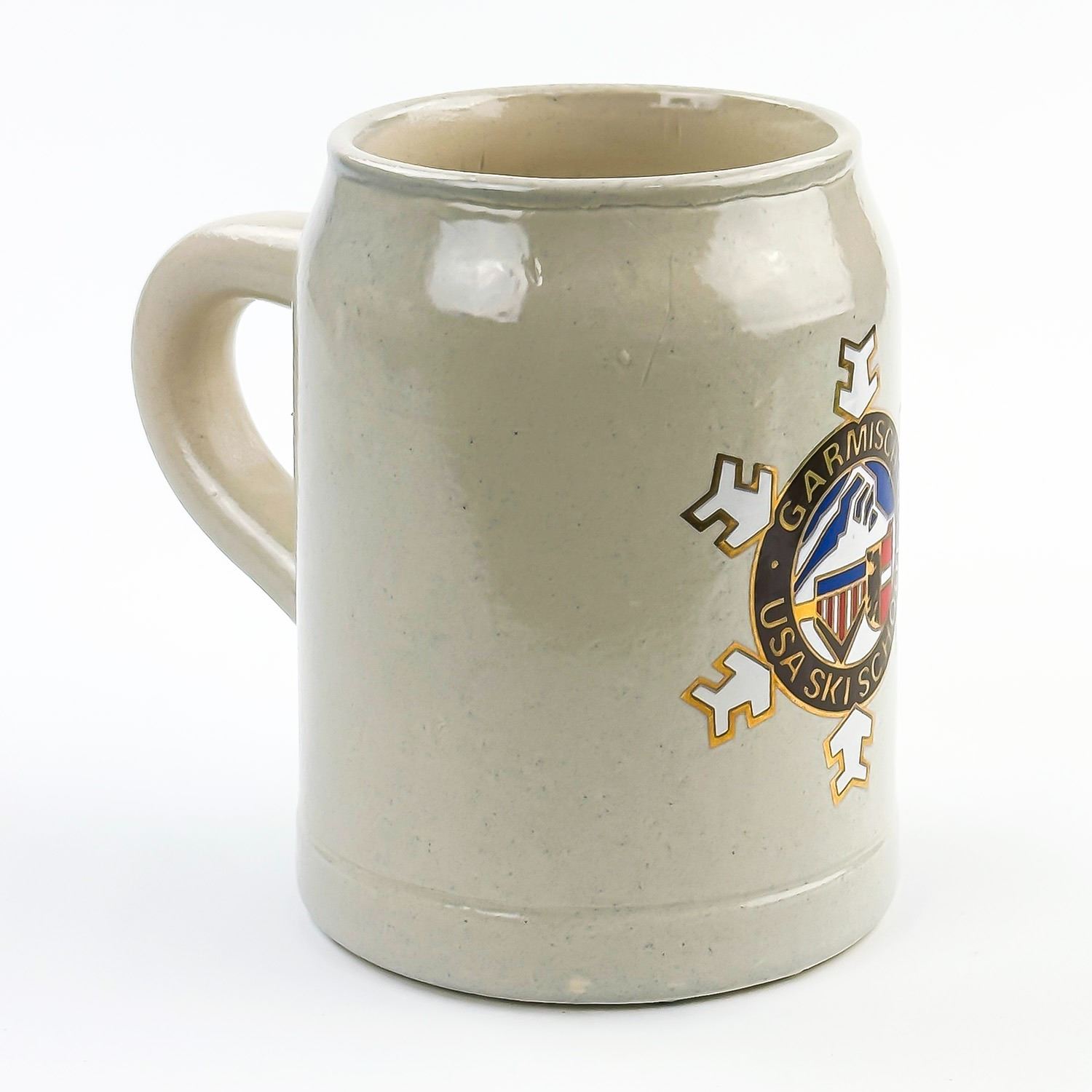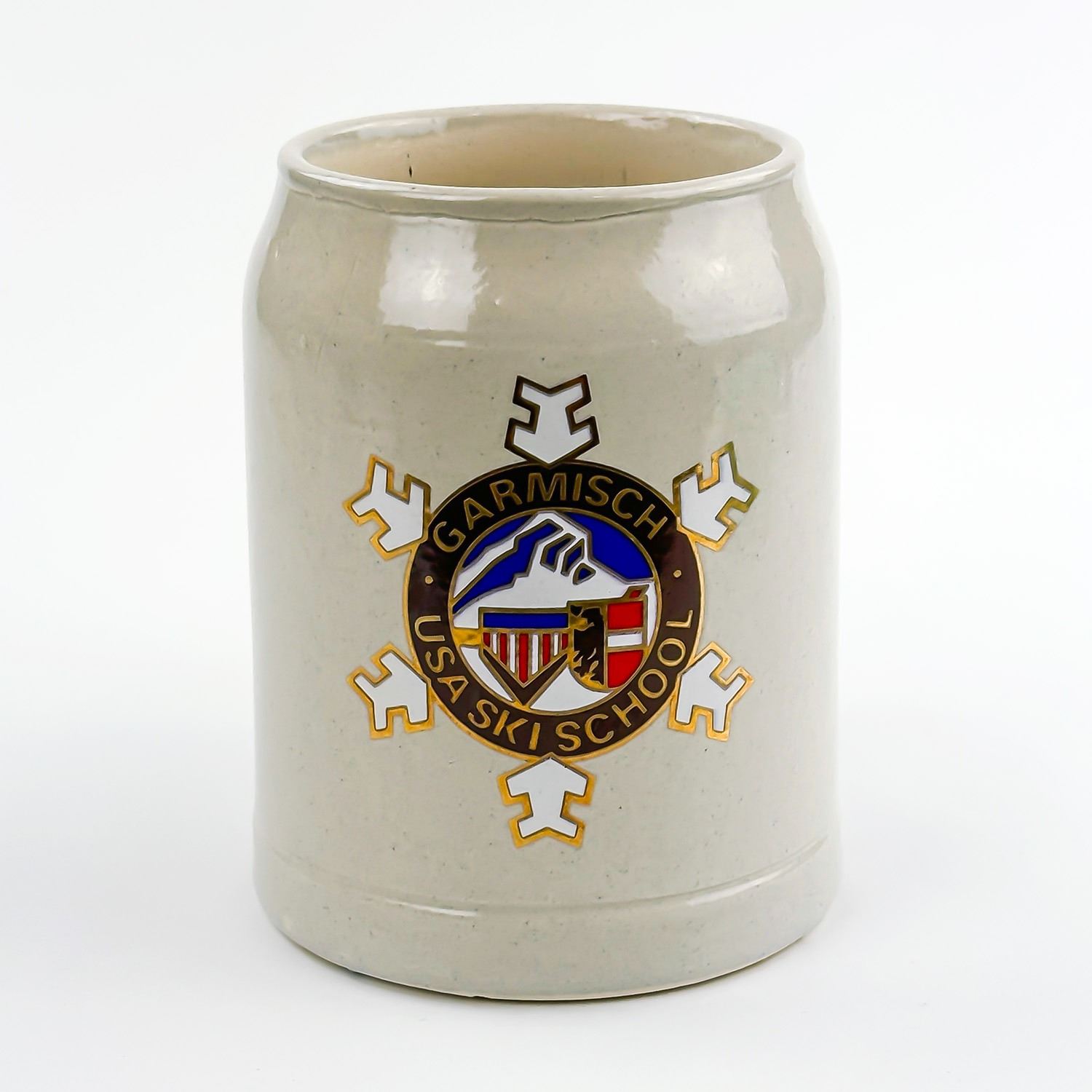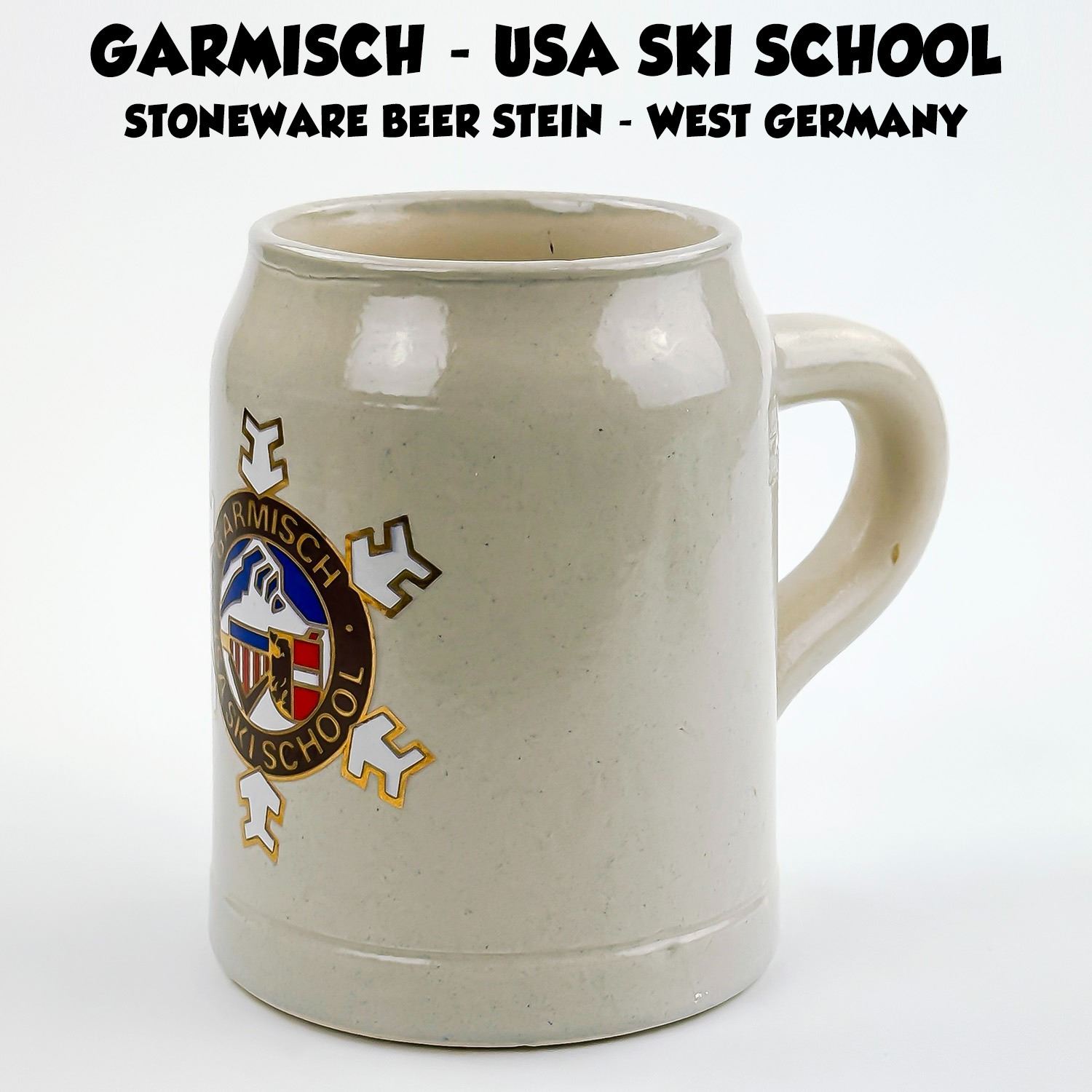 #8342 - MADE IN WEST GERMANY STONEWARE POTTERY BEER STEIN - GARMISCH USA SKI SCHOOL LOGO. SKI HILL MOUNTAIN SKIING SNOW WINTER COLLECTIBLE. HOME OFFICE KITCHENWARE BAR BARWARE DECOR. MEASURES: 5.125” (13 CM) TALL BY 4”(10 CM) BASE DIAMETER