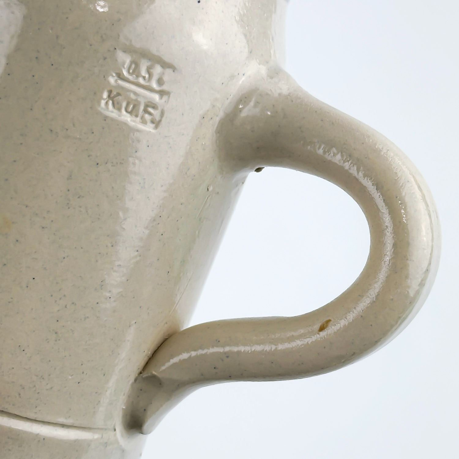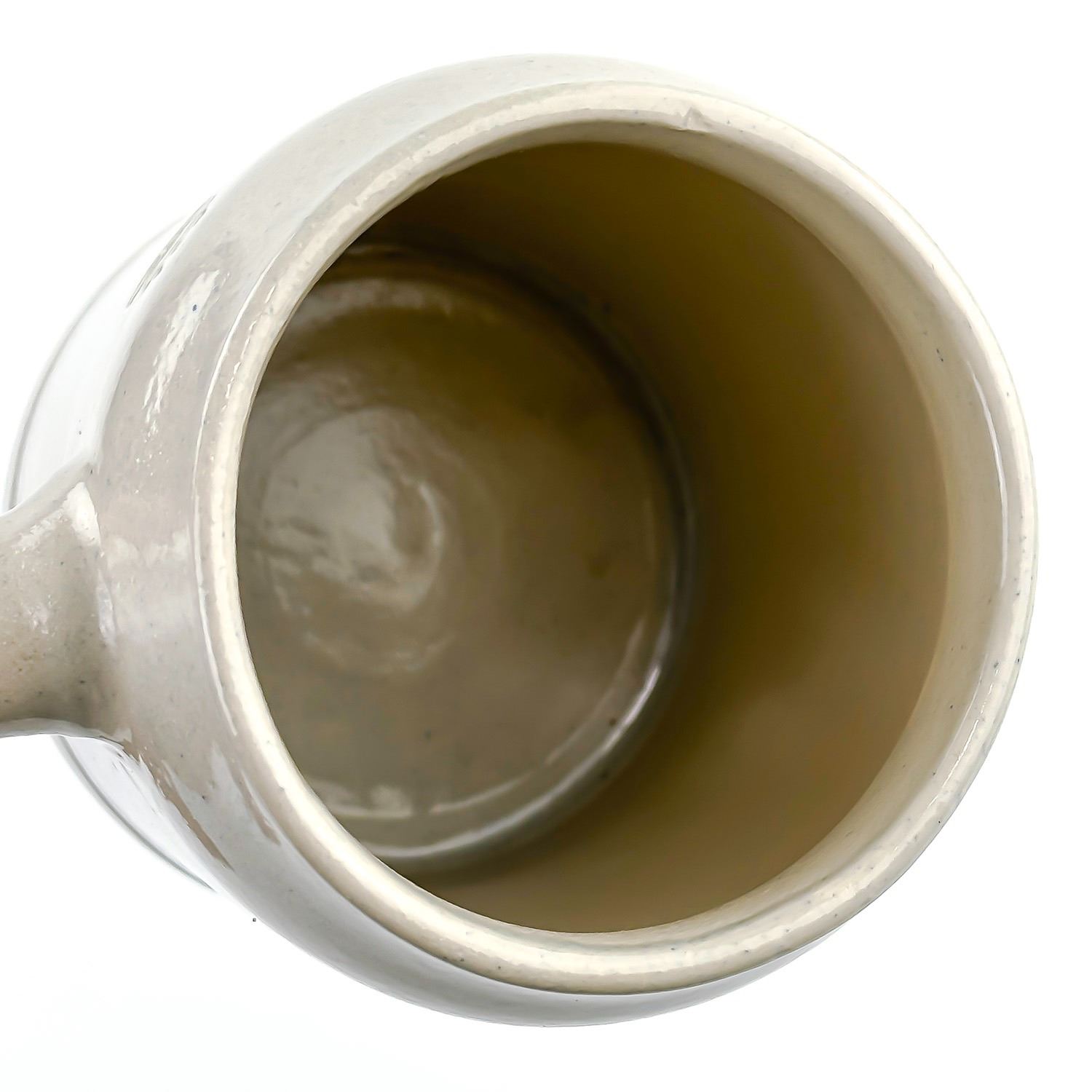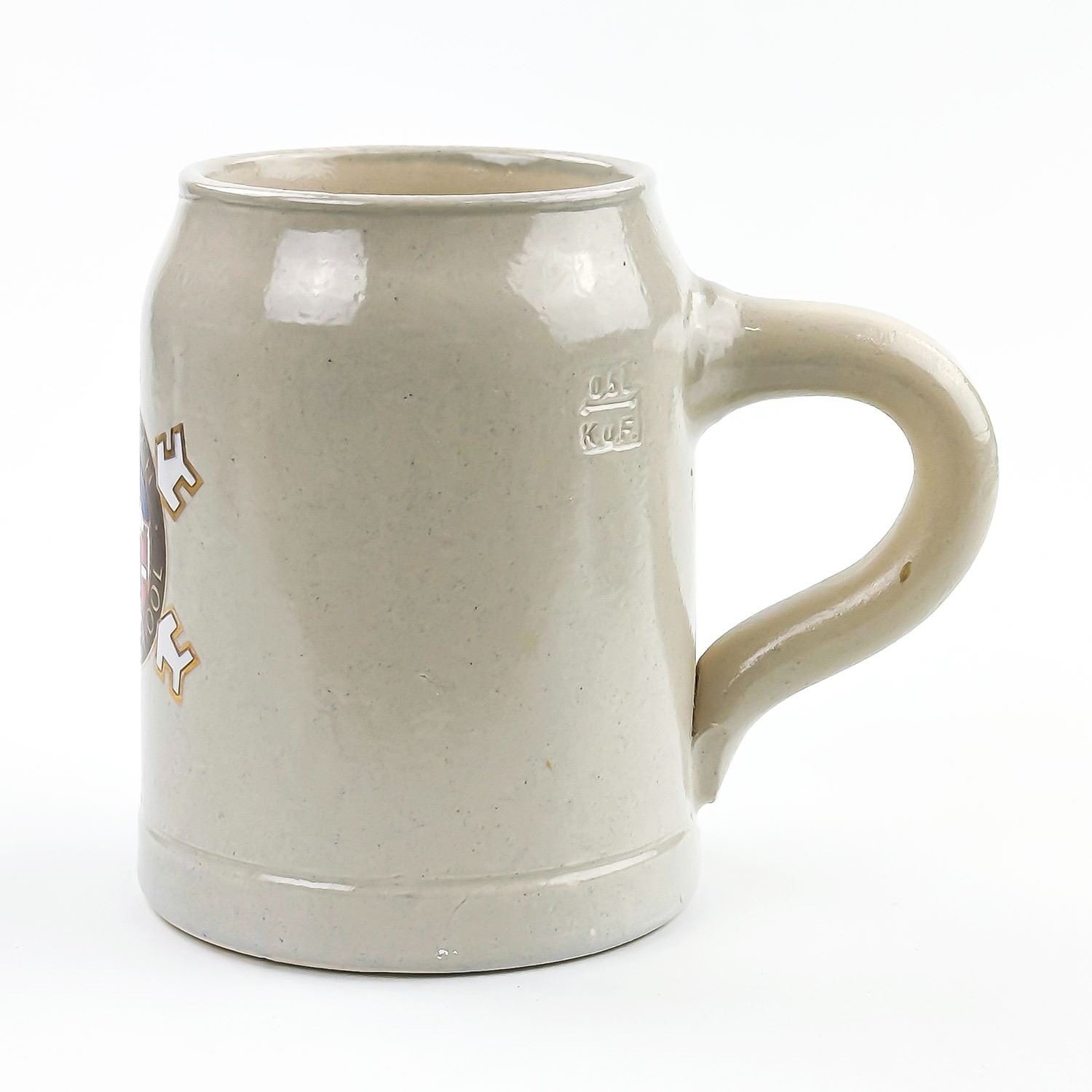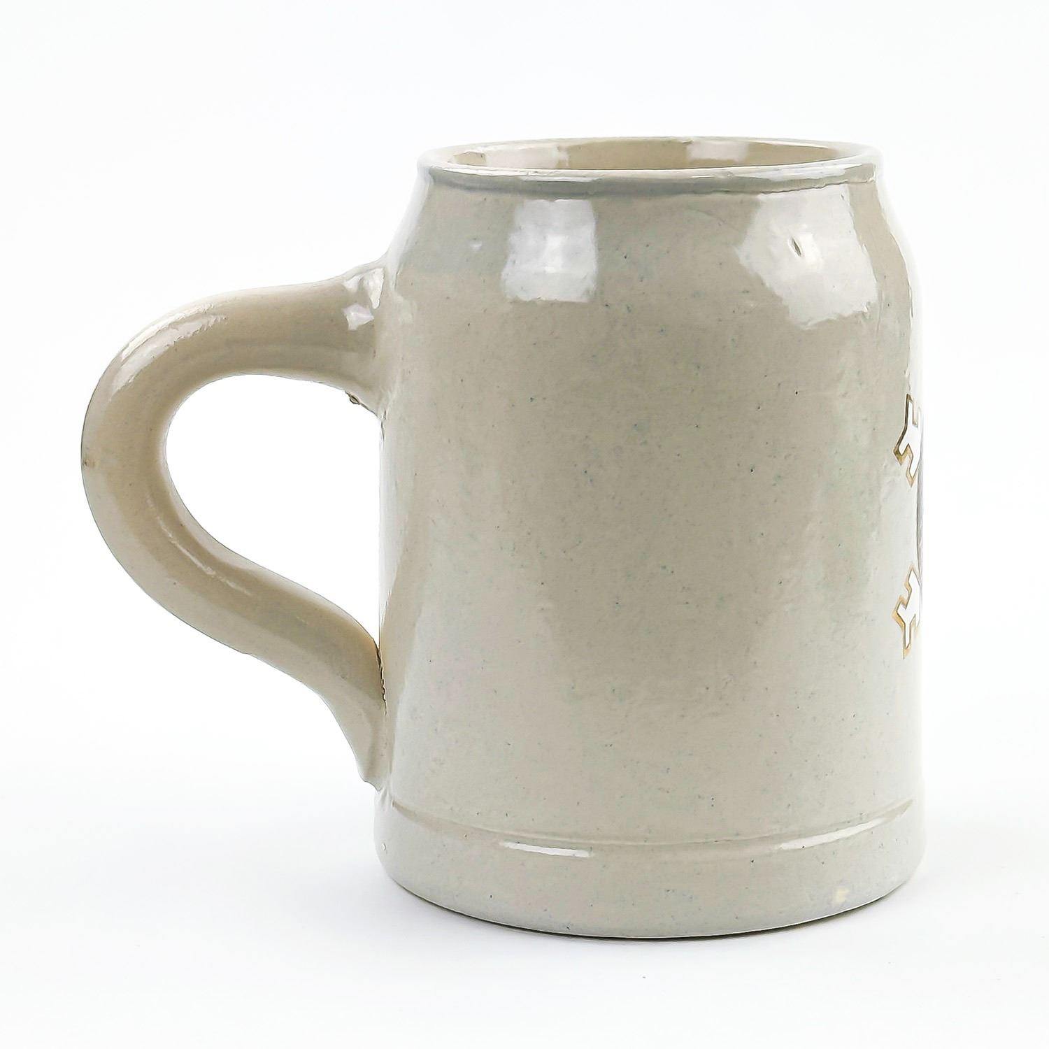 #8342 - MADE IN WEST GERMANY STONEWARE POTTERY BEER STEIN - GARMISCH USA SKI SCHOOL LOGO. SKI HILL MOUNTAIN SKIING SNOW WINTER COLLECTIBLE. HOME OFFICE KITCHENWARE BAR BARWARE DECOR. MEASURES: 5.125” (13 CM) TALL BY 4”(10 CM) BASE DIAMETER
