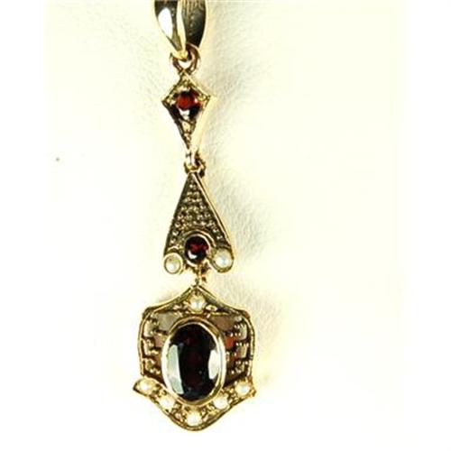 This ANTIQUE VICTORIAN Style Necklace Lavalier is an Authentic and Accurate copy of one from the 1900's but THIS one is in MINT condition. It is 9K GOLD and it features an Oval GARNET surrounded by SEED PEARLS and FILIGREE work. This lovely Lavalier Pendant is 1 1/8 inch in height and it is suspended from a 14k Gold Chain 18 inches long.