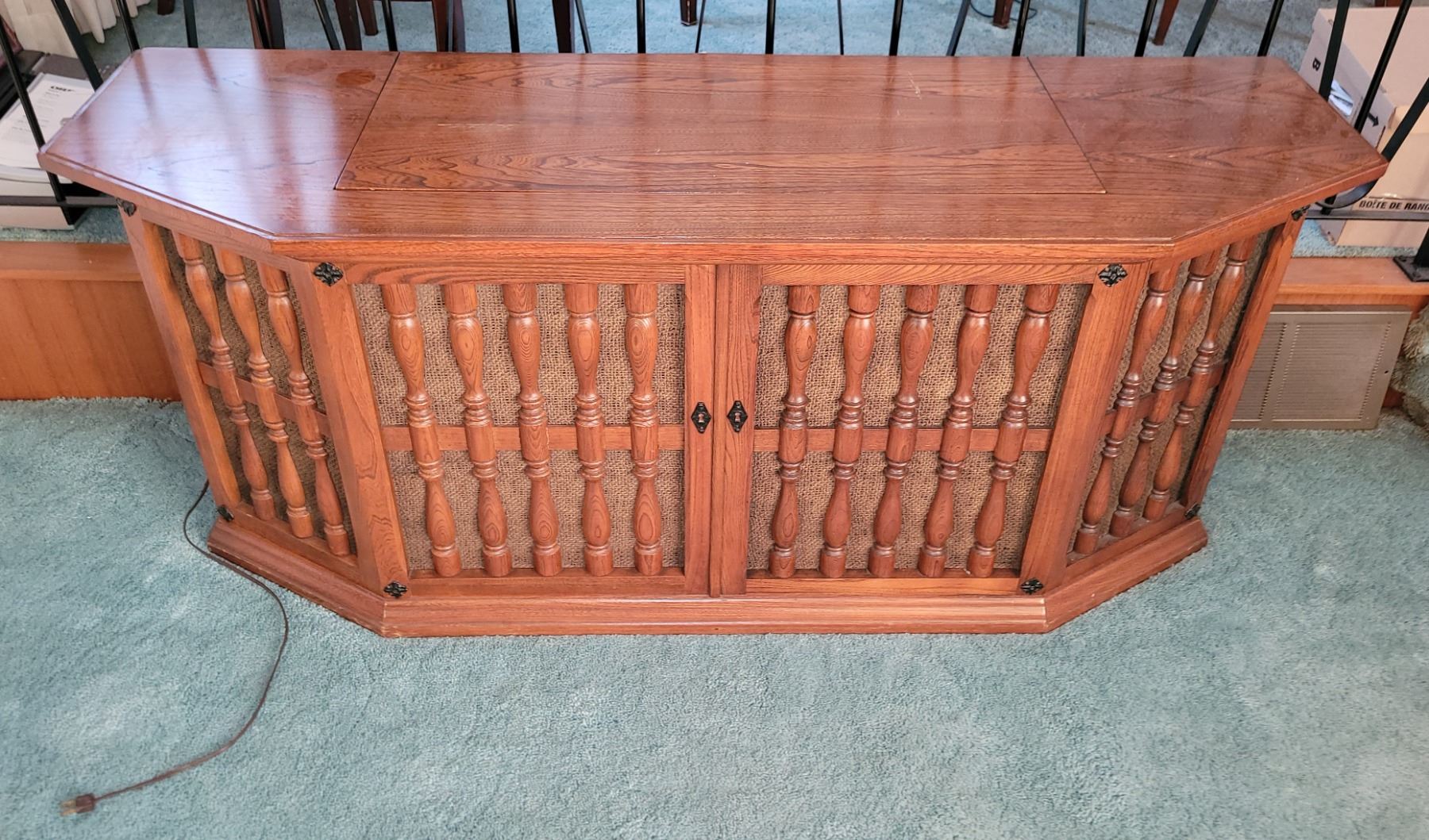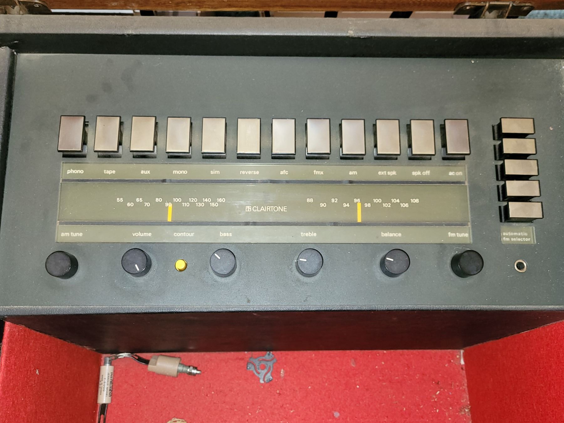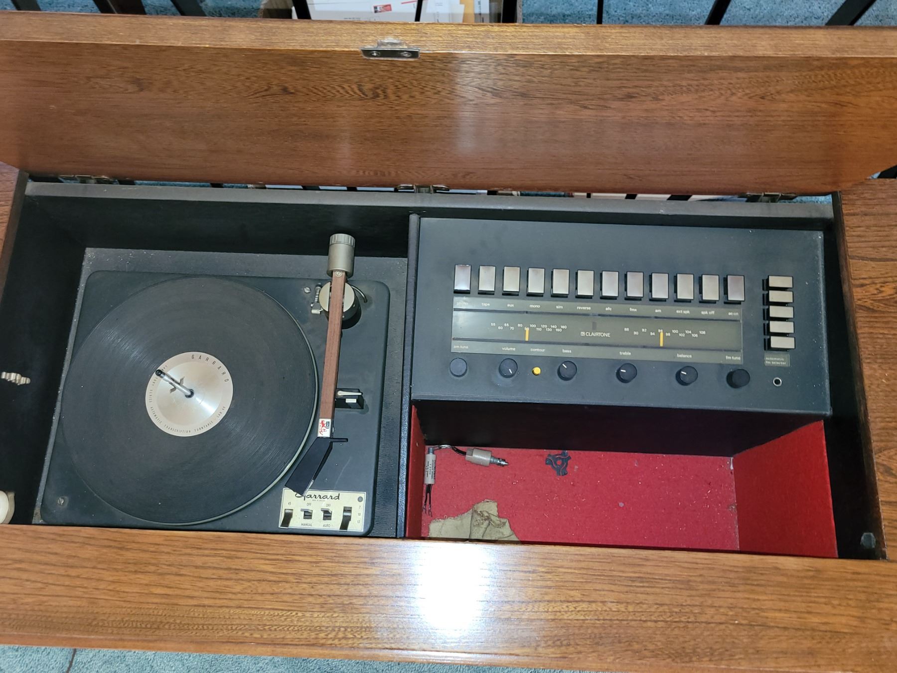 WITH RECORD PLAYER, RADIO. WORKING. SPEAKERS COME AND GO. COMES WITH MANUAL. HAS SMALL SCRATCH ON TOP. SEE PICTURES