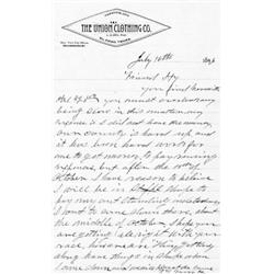 <b>1389. PATRICK F. GARRETT</b> (1850 - 1908) American frontier lawman who tracked down and killed Billy the Kid, he later organized the LS Pat Garrett Rangers to put down cattle rustling in the Texas Panhandle. Good content and rather cryptic A.L.S. "<i>P. F. Garrett</i>" on Union Clothing Company letterhead, 1p. 8vo., El Paso, July 16, 1896 to his old friend Hy Bowles. While running for sheriff, Garrett settles a $20 debt owed to Bowles, apologizing for his lateness in paying. He notes: <i>"ÉMy excuse is I did not have the money. Our country is hard up, and it has been hard work for me to get money to pay running expensesÉI have reason to believe I will be in shape to pay my outstanding indebtednessÉI hope you are getting all right with your race. How are `they' getting along, have things in shape when I come down and we will play at the gameÉ</i>". Fine condition.<b> $2,000-3,000</b>