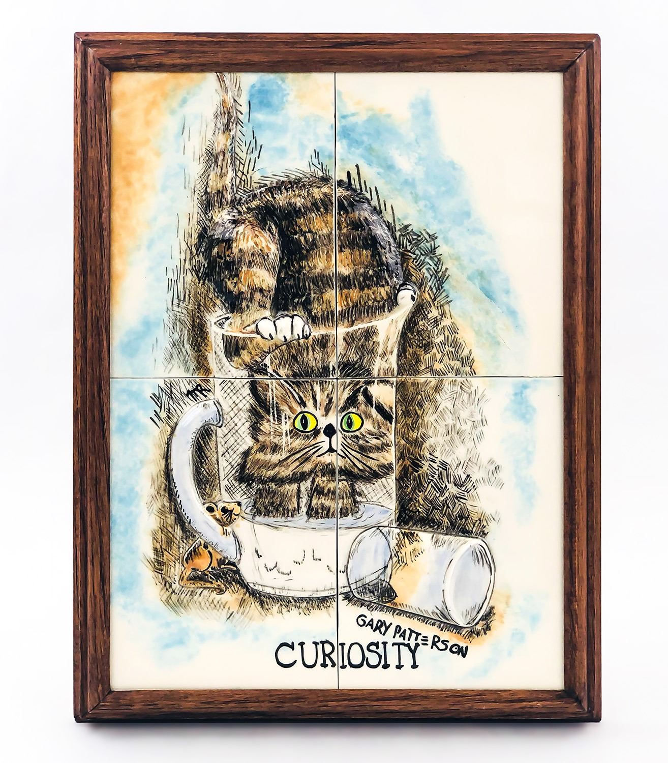 #8773 - GARY PATTERSON: AMERICA’S MOST POPULAR ILLUSTRATOR OF CATS, FOUR PAINTED 3D CERAMIC TILES IN A FRAME, THE GLASS, CAT AND CUP LOOK 3D. FAIRLY HEAVY PIECE, SIZE: 9.25” (23.5 CM) X 12.25” (31 CM)***ITEM(S) LOCATED IN LETHBRIDGE ALBERTA. ALL ITEMS IN THIS AUCTION QUALIFY FOR OUR FREE TRANSPORT TO EDMONTON SERVICE. WORLDWIDE SHIPPING AVAILABLE