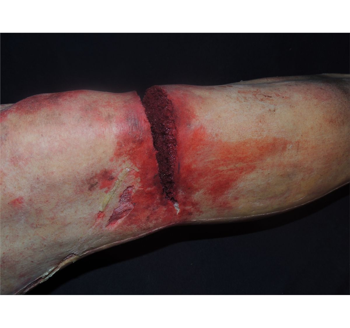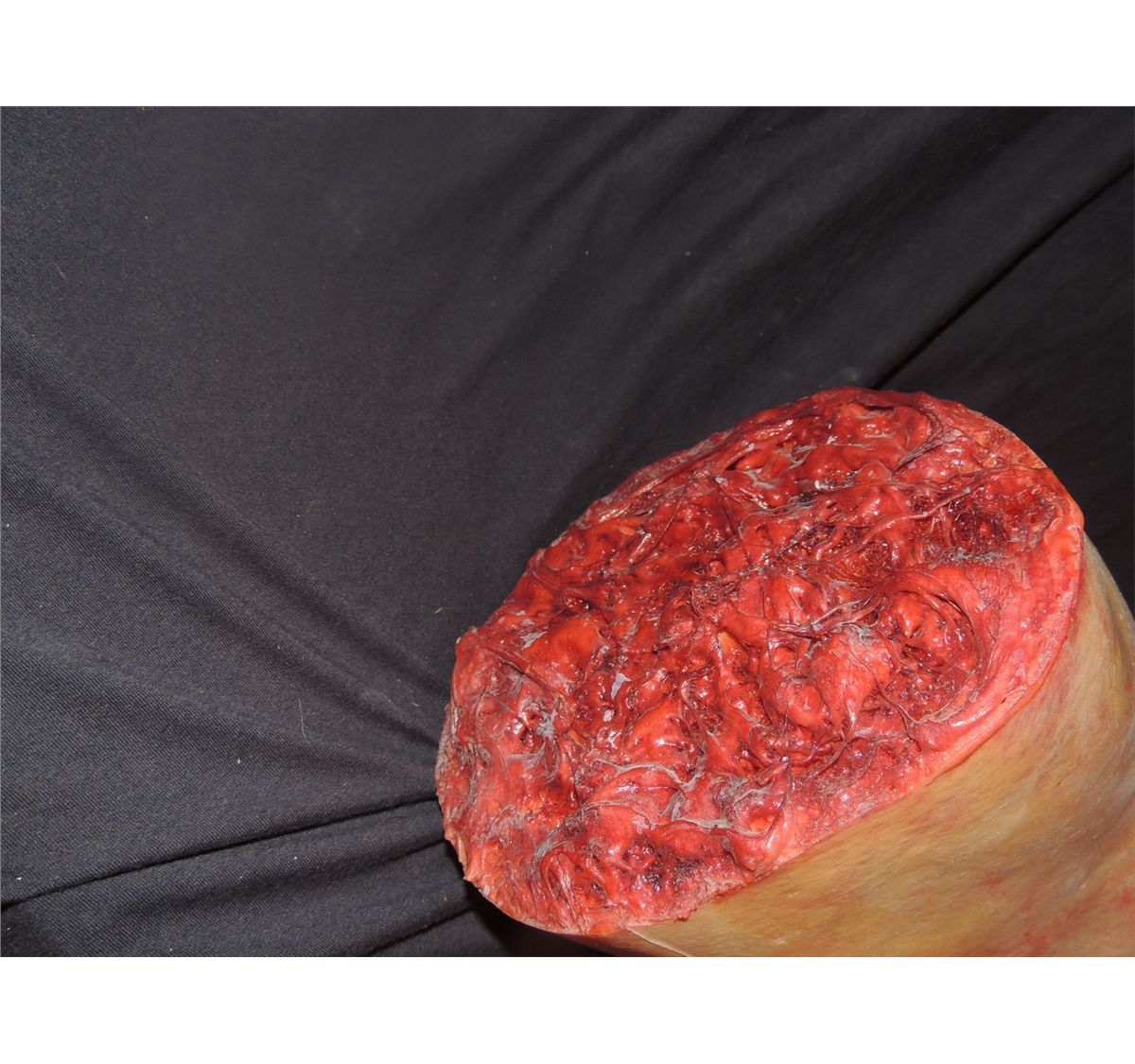 This is a top quality foam filled latex leg with foot in excellent condition. Has a gash in thigh and excellent gore at stump.