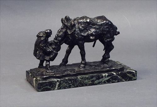 GASTON BROQUET (1880-1947) An important textured cire perdu cast black patinated bronze figure of a man tending his horse. Signed with Le Blanck-Barbedienne Foundry mark. Raised on green marble base. 7" wide, 4 1/2" high. Ref. Benezit, vol 2, page 153.