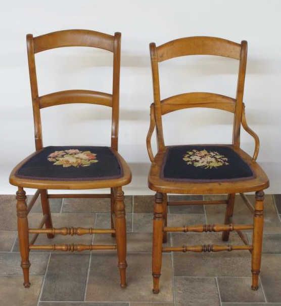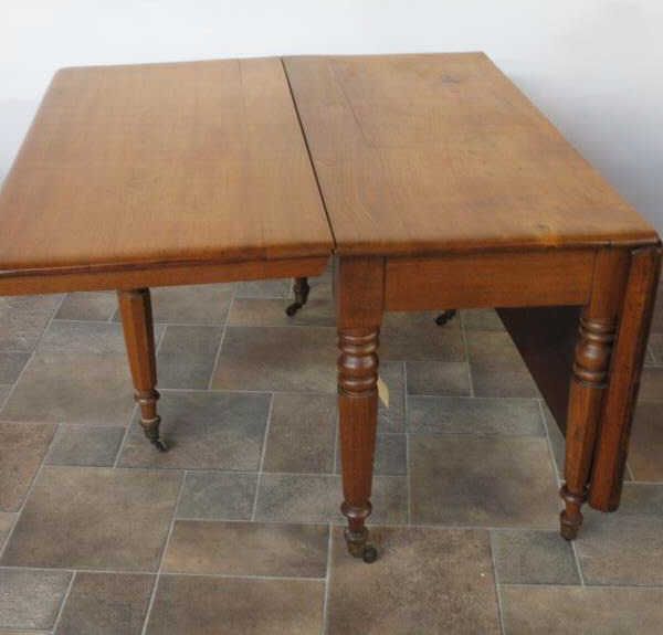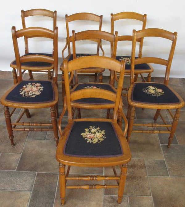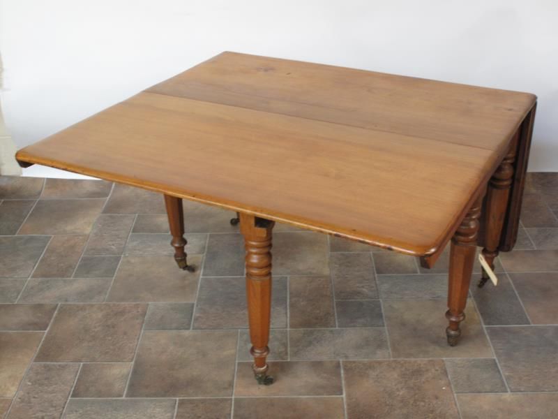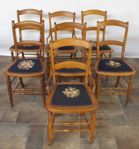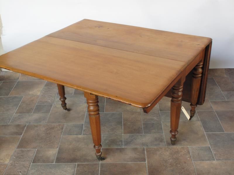 -late 19th century, On turned legs with over-sized drop leafs. Dining chairs have blue needle point upholstery.