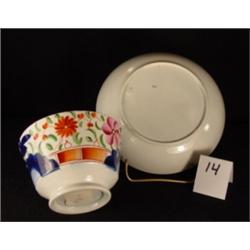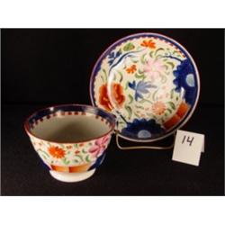 Gaudy Dutch handleless cup & saucer; in double rose pattern, the overglaze cobalt blue nicely complemented by flowerheads and leaves, expertly hand painted in pink, green and shades of iron red; stylized tulip border design on both pieces. Footed, slightly flared cup is 2.5" high, 3.75" diameter w/tight hairline visible only from inside & 2 tiny flakes under foot. saucer is 5.75 " with great paint & no damage.