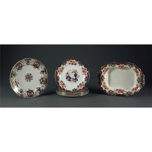 STONEWEAR: Seven pieces of English Gaudy Welsh/Imari porcelain to include a ''Ravenscliff Dunnbennett'' dinnerplate 10'', five ''Celeste, B & L'' salad plates 8 1/2'', and a ''celeste, B & L'' pedestal serving dish, 12'' x 8 1/4'', glaze crack noted to the underside of one salad plate, crazing noted on all.