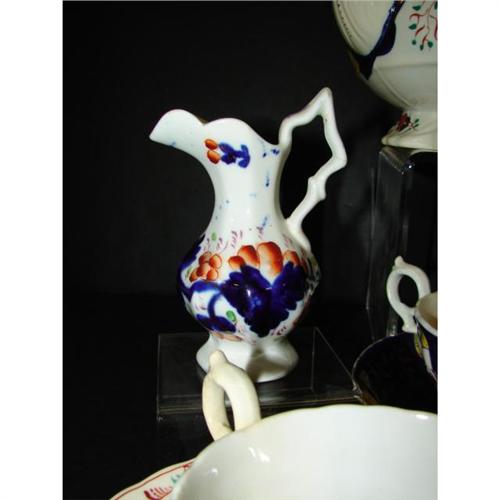 14 PIECE GAUDY WELSH TEA SET. Comprising a teapot with lid, sugar bowl with lid, and six cups and saucers. Together with a gaudy welsh cream pitcher. The teapot 7.5” high to finial, with minor scratches to decoration and tight hairline from rim; the sugar 6” high to finial, with minor flakes to interior rim of finial, and minor scratches to decoration; the saucers all with wear to interiors, one with small chip to base, one with hairline; the cups all with wear to interior flower – one entirely worn, a few hairlines and chips; the associated creamer with hairline from rim.