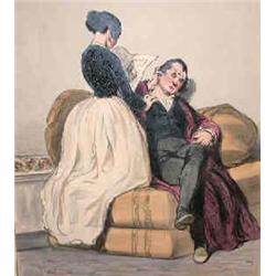 GAVARNI.- Fourberies de femmes. En matière de sentiment. 2e série. [ Paris], Aubert, [-Bauger] (impr. d'Aubert & Cie), s.d. In-4° : 52 planches numérotées de 1 à 52 (inc. de la pl. 41), suivies de [8] pp. de catalogue (int. frais). Rel. d'époque : demi-chagrin violine, plats de papier violine estampé, pll. montées sur onglets (dos quasi dérelié, coupes émoussées, mors fendus avec manque au haut du dos, 4 pll. déreliées). Bel album dont les planches ont été entièrement mises en couleurs et partiellement gommées. L'éditeur Aubert était spécialisé dans les sujets caricaturaux : il fut entre autres l'éditeur des revues La Caricature et le Charivari. 620 Euros
