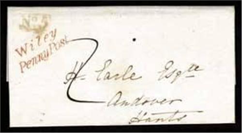 1838 entire from Langford to Andover, bearing a boxed 'No.5' receiving house mark and a superb crisp 'Wiley/Penny Post' h/s with an equally superb 'Wiley' on reverse, both in red (W&J WL 815+820)