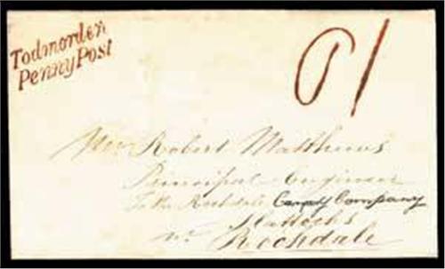 1840 March entire from Todmorden to Rochdale bearing superb strikes of the 'Todmorden/Penny Post' and 'P1' h/s (W&J LA 1090+1095), backstamped at Halifax for MR.25.1840