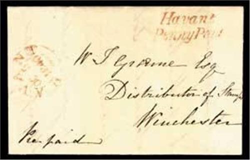 1840 October 5 entire from Havant to Winchester bearing a fine strike in red of the distinctive 'Havant/Penny Paid' h/s (W&J HA 564), accompanied at left by a matching Havant despatch cds