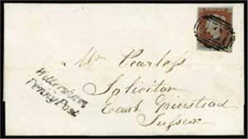 1841 May 1d red brown on very blue paper (SG 8a), tied to wrapper by Peasmarsh '431' numeral with a neat two line 'Wittersham Penny Post' (Willcocks 1358) in black at lower left, backstamped with undated Peasmarsh cds, Staplehurst double-arc cds for MY.28
