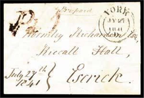 1841 July 27 wrapper from York to Escrick bearing a brownish red strike of the distinctive 'Pd 1' (W&J YK 3342) with a York despatch cds at right