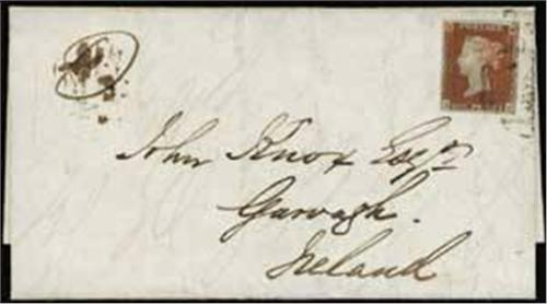 1842 June 22 entire franked with 1841 1d orange brown pl.20 (SG 12) tied by black MC leaving profile clear, addressed to Gavagh, Ireland, and backstamped in London and Dublin JU.23.1842, attractive
