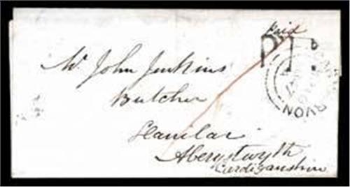 1847 March 10 entire from Carnarvon to Aberystwyth bearing a fine strike of the distinctive 'Pd 1d' h/s in black (W&J W 704) with a matching Carnarvon cds alongside, backstamped with a Tremadoc udc and Aberystwyth receiver for the MR.11.1847, scarce