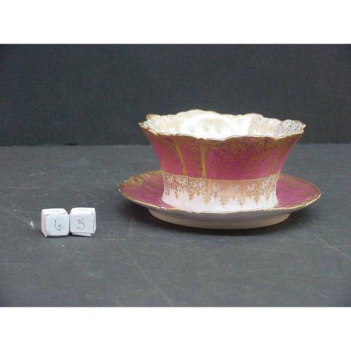 Molded together a sauce bowl and Underplate, gold trim, pink background with gold floral designs, marked GDA Limoges, other than minor wear to the gold, this is in really good condition. 5 1/2" wide by 2 1/2" tall.