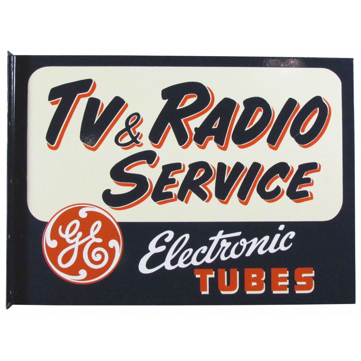 GE TV & Radio Service Heavy Porcelain Flange Sign, two sided. Mint condition. 15 1/2 X 12 inches.