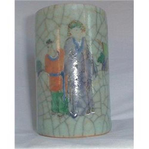 GUANGXU period Famille Verte "GE" ware or Guan glazed BRUSHPOT with polychromed Mandarin scolar figures. The brushpot is thickly potted, and a fine example of late Qing Dynasty Ge ware. The brushpot is signed with impresed character mark on base.<p> Dimensions: Height 5"(12.50cm)