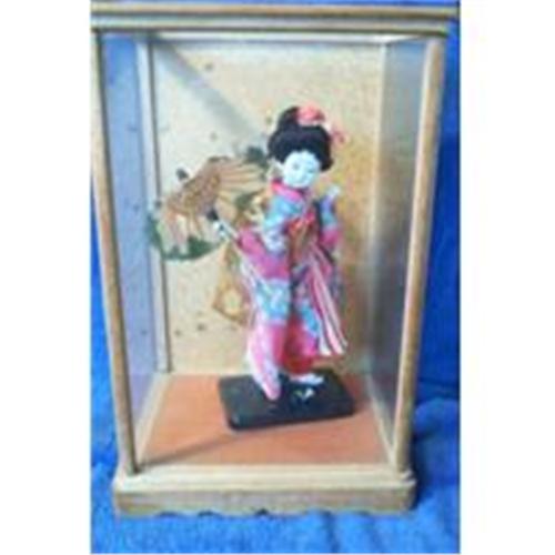 IS THAT SPECIAL LADY IN YOUR LIFE A DOLL COLLECTOR?. Purchased from Japan in 1954, this authentic Geisha Girl Doll comes in her own display case. The case measures 13 inches by 8 1/2 inches. The ceramic doll measures 10 inches and is designed in vibrant native costume, right down to her tiny painted shoes. Her umbrella has sustained a bit of damage, but could easily be replaced as I have seen these umbrella's in many novelty shops.I have also seen glass display cases prices over $100.00. So she is realistically priced.