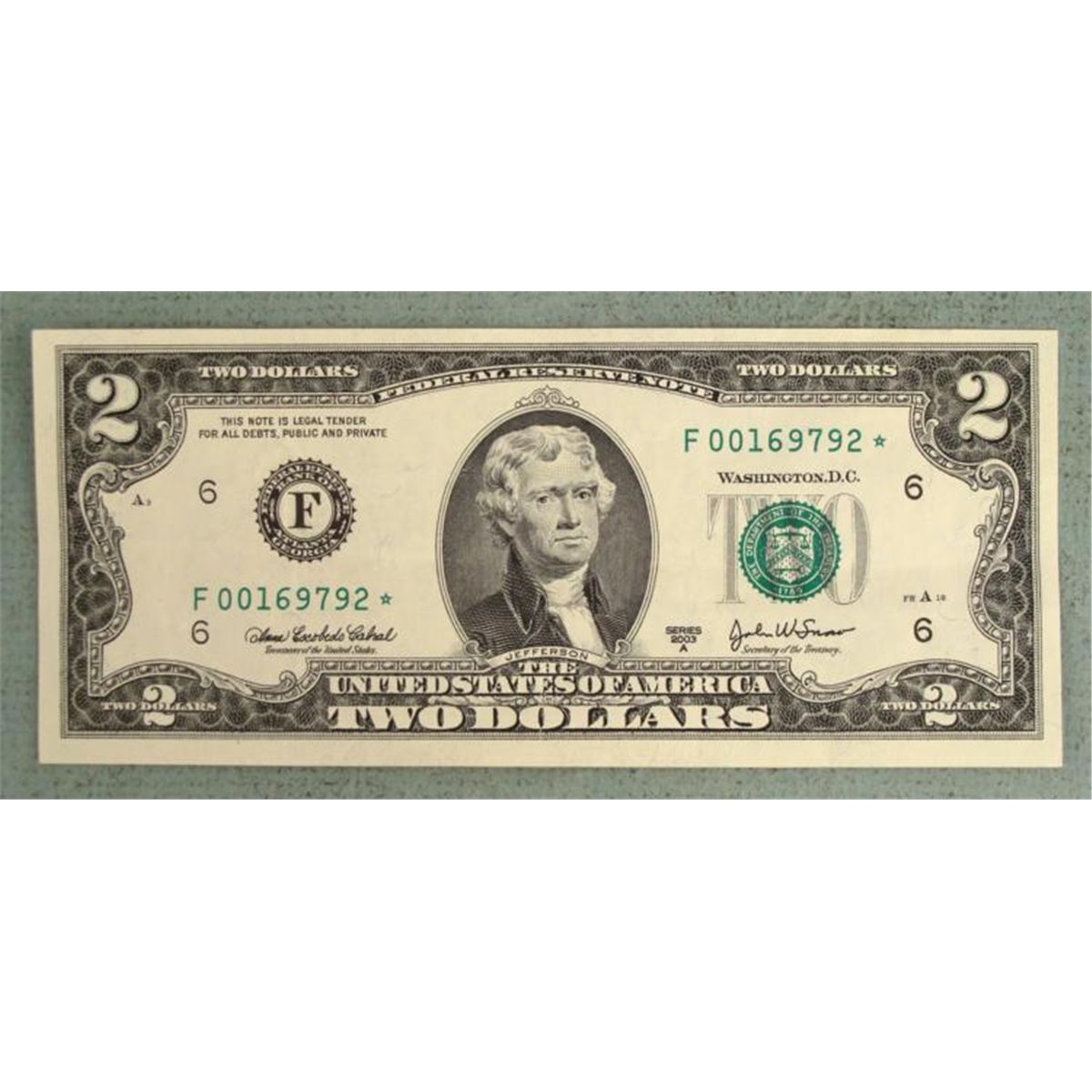 2003 $2 Star Note * Serial number: Low numbers: starting with 001..Mint mark: F (Atlanta)Condition: Gem