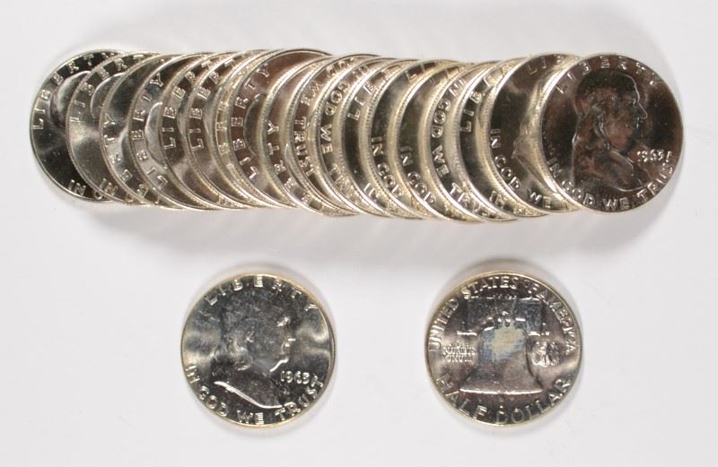 GEM BU ROLL OF ( 12 ) 1960, ( 6 ) 1963 AND ( 2 ) 1958 FRANKLIN HALF DOLLARS
