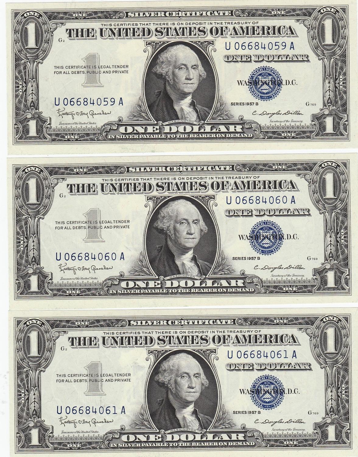 GEM RUN OF 3 $1 SILVER CERTIFICATES 1957