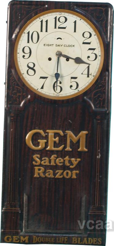 GEM Safety Razor Embossed Tin Sign "GEM Double Life Blades" w/ 8-day clock, all original - 12" x 29"