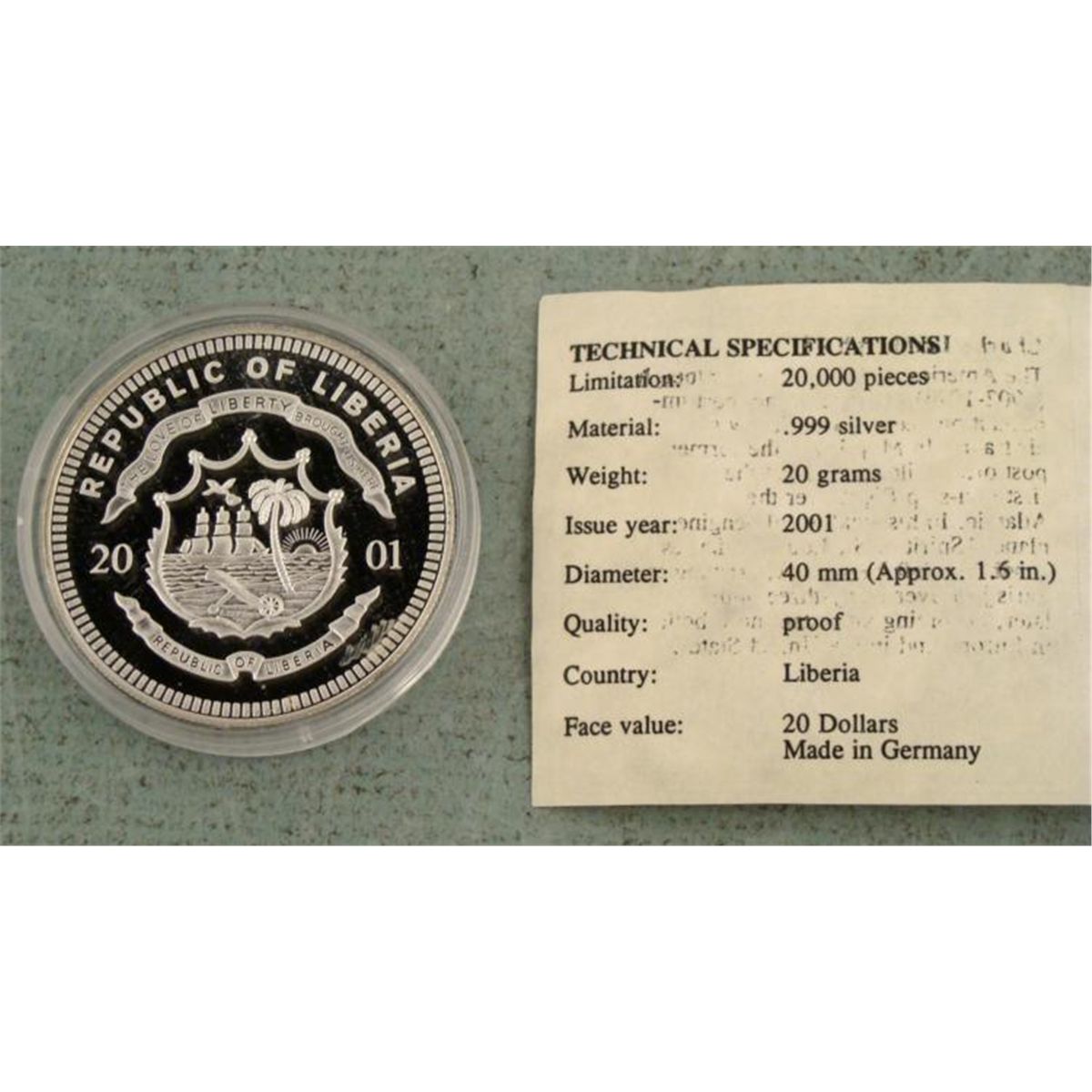 Offered her is a 2001 commemorative GEM, Uncirculated, .999 silver coin from Liberia. On one side is a picture of Charles Lindbergh and a plane, that reads History of America, 1927. On the other side is a picture of an island, a ship, a sunset, and a airplane and reads Republic of Liberia. * * The diameter of the coin is 33 mm. The coin comes in a protective case and a Certificate of Authenticity from American Mint. *