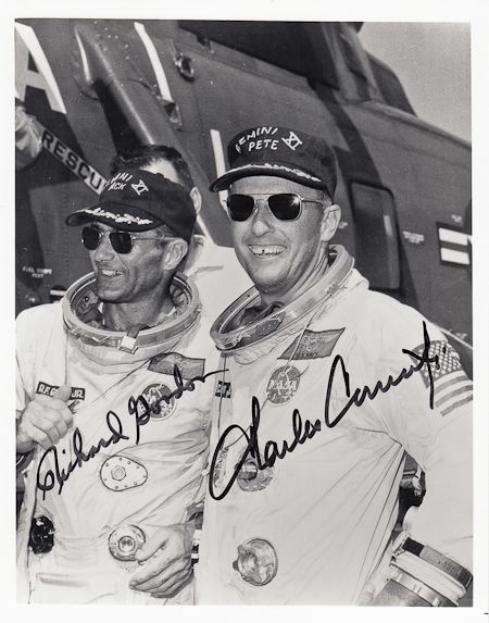 S.P 8" x 10" b/w, a fine image of CHARLES CONRAD, JR. and RICHARD GORDON on the flight deck of the recovery carrier following their return to earth after the flight of Gemini XI, boldly signed in black marker by both. Fine.