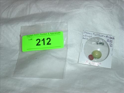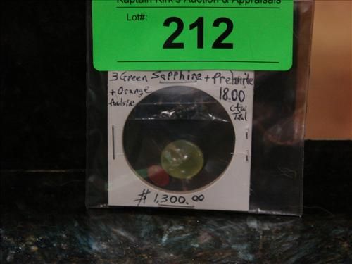 APPEARS TO BE 3 GREEN SAPPHIRE & PREHNITE & ORANGE ANDESINE THESE GEMSTONES, LIKE ALL ITEMS PRESENTED AT AUCTION, ARE PRESENTED WITH THE DESCRIPTIONS AND INFORMATION AS PROVIDED BY THE CONSIGNOR. THE AUCTIONEER DOES NOT REPRESENT THEIR DESCRIPTIONS OR VALUES TO BE NOTHING MORE THAT THOSE PROVIDED BY THE CONSIGNOR. THE AUCTIONEER DOES NOT REPRESENT THEM TO BE ACCURATE. PLEASE DO YOUR OWN DUE DILIGENCE, AND BID ACCORDINGLY. ALL SALES ARE FINAL, AND ALL ITEMS ARE SOLD AS IS, WHERE IS.
