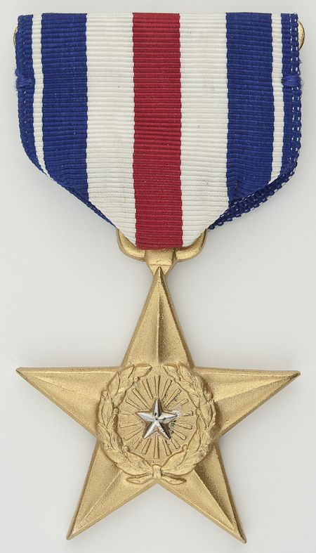 Important pair of Canham relics, Canham's Silver Star medal along with the original award. The award, issued by the Headquarters of the 29th Infantry Div. on June 22, 1944, is marked "RESTRICTED" and cites Canham's heroism: "...on the 8th June 1944 Colonel Canham personally led his combat team in an assault on the town of * * * , France. He was constantly in command of the situation and often exposed himself to enemy fire without regard for his own safety. His presence was an inspiration to the troops. He continuously moved with the forward elements and his courageous actions inspired the men to keep advancing and obtain the objective...". Very good. In a later typed copy of the award (included), Canham clarifies the name of the town, noting that it was "Grandcamp-les-Bains".