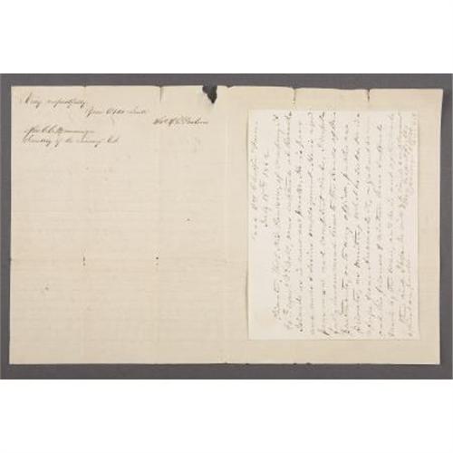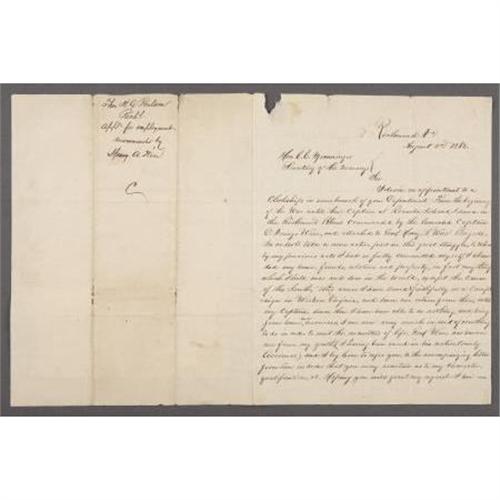 <B>GEN. HENRY A. WISE AUTOGRAPH LETTER SIGNED, 1862.</B></I> Wise (1806 - 1876) was an American statesman born in Drummond Town, Accomack County, Virginia, to a family of wealthy planters. He served as a brigadier general in the Confederate Army. <BR><BR>This first part of this document is a letter written by <I>“H. G. Poulson” </B></I>to C. C. Memminger,<I> </B></I>Secretary of Treasury. Using Henry A. Wise as a reference for job. Poulson letter in part "<I>...this cause I have served faithfully in a Campaign in Western Virginia, and since our return from there; until my capture, since then I have been able to-do nothing, and being form home and resources, I am now very much in need of something to do in order to meet the necessities of life. Gen. Wise has known me from my youth, (I having been raised in his native County Accomac) and I beg leave to refer you, to the accompanying letter from him in order that you may ascertain as to my character qualifications...</B></I>"<BR><BR>The Henry A. Wise ALS is signed "<I>Henry A. Wise Brig. Genl.</B></I>". One page 7.75” x 5.75” on blank paper, pasted to above letter by Poulson, Head Div. Chaffin’s Farm, July 15th, 1862. Wise letter in part "<I>Private, Tho. H. G. Paulson, of Company 'A' 46th Regmt. Va. Vols., was captured at Roanoke Island as is now on parole. He is poor and needs & desires employment...</B></I>" Two great letters. <BR><BR><B>Condition:</B></I> Fine, small separations, small piece missing upper left corner.<BR><BR><b>Shipping:</b> Flat Material, Small (<a target="_blank" href="http://www.heritageauctions.com/common/shipping.php">view shipping information</a>)