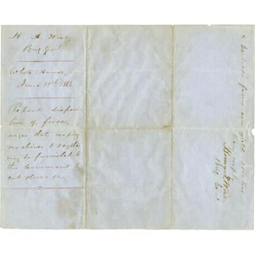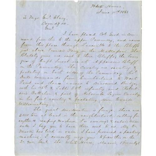 <B>GENERAL HENRY A. WISE AUTOGRAPH LETTER SIGNED TO GEN. ELZEY, 1863.</B></I> Wise was born in Drummond Town, Accomack County, Virginia, to a family of wealthy planters. He served as a brigadier general in the Confederate Army and afterward was promoted to the rank of major general. He commanded the District of Roanoke Island during the Battle of Roanoke Island. His part in the decision to cede the island when faced with much greater Union forces drew the ire of some of the Confederate government leadership. <BR><BR>Henry A. Wise ALS <I>“Henry A. Wise”.</B></I> One page with docketing on verso, 8” x 10” on blue lined paper. White House, June 11th, 1863. Docketed: "<I>H. A. Wise, Brig. Genl. White House, June 11th 1863. Report disposition of forces, urges that reaping machines & scythes may be furnished to this Command to cut clover, etc." </B></I>The letter reads, in part, "<I>To Mgr Genl. Elzey Comd'g &c.. Genl. I have placed Col. Good in command from this to the upper Pamunkey, and across from this place through Lanesville to the Bluffs just above Francies Ferry on the Mattasoni... Col. Duke commands from Cumberland to West Point and thence across to Diascumd Bridge, with his 46th & Tabb’s 59th infantry and Robertson’s Battalion & part of Holcombe Legion Cavalry, in his front scouting & picketing down towards Williamsburg. The great desideration is forage. There are 2000 tons at least in this neighborhood calling for scythe's & reaping machines... Very resply, Henry A. Wise, Brig. Genl</B></I>."<BR><B><BR>Condition:</B></I> Fine, two small pin holes in folds, couple of small chips.<BR><BR><b>Shipping:</b> Flat Material, Small (<a target="_blank" href="http://www.heritageauctions.com/common/shipping.php">view shipping information</a>)